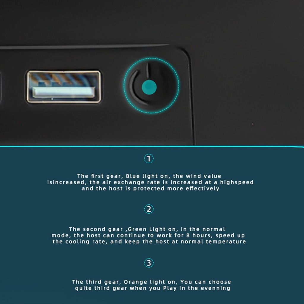 3 speed adjustable touch switch, 3 speed silent mode the switch key lights up in orange, for silent cooling at night or when quiet is required, 2 speed normal mode: the switch key lights up in blue. In normal mode, 1 speed super mode: the switch key lights up in green, the wind value increases.