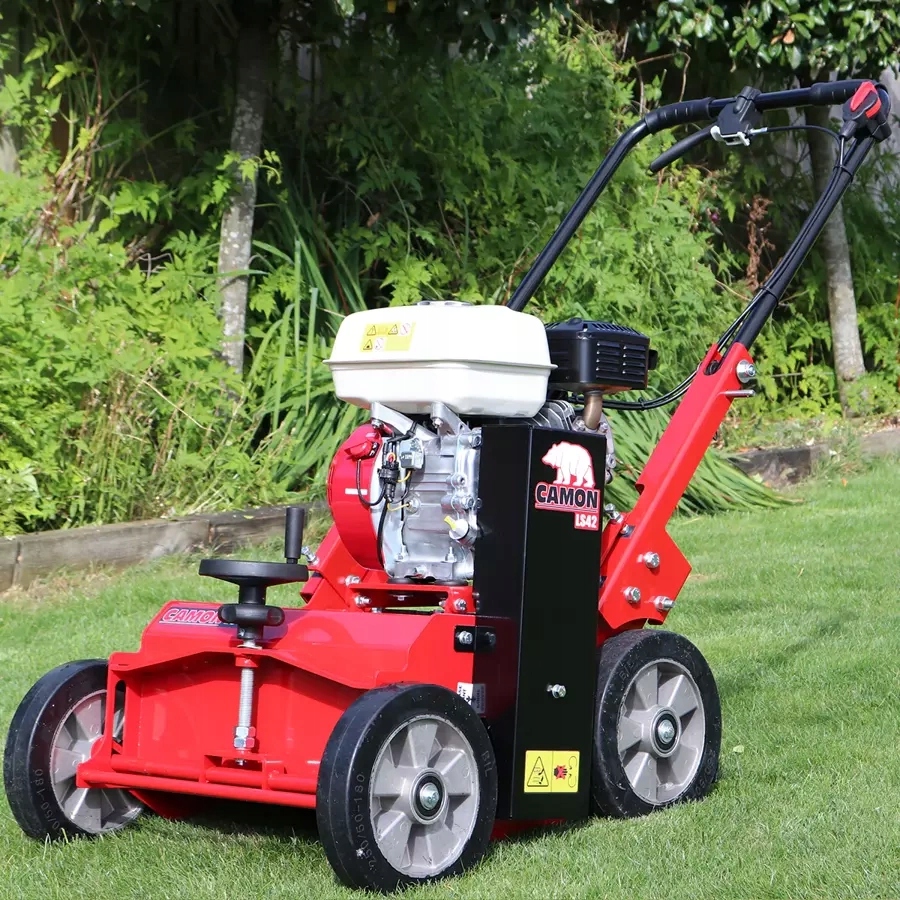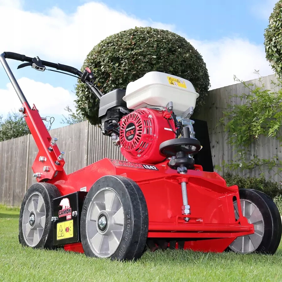 Wertykulator z uchylnymi nożami Camon LS 42 B1 do prowadzenia napowietrzania i oczyszczania trawnika z filcu i mchu. Zastosowanie noży o kształcie tzw. rybiego ogona pozwala na skuteczne wygrabienie resztek skoszonej trawy i gromadzącego się filcu nawet kilka razy w ciągu sezonu. Jednostką napędową aeratora jest silnik Honda GX 160 przeznaczony do zastosowania w urządzeniach komercyjnych. Wał roboczy o szerokości roboczej 42 cm wyposażony w 30 sprężyn jest uruchamiany za pomocą dźwigni .