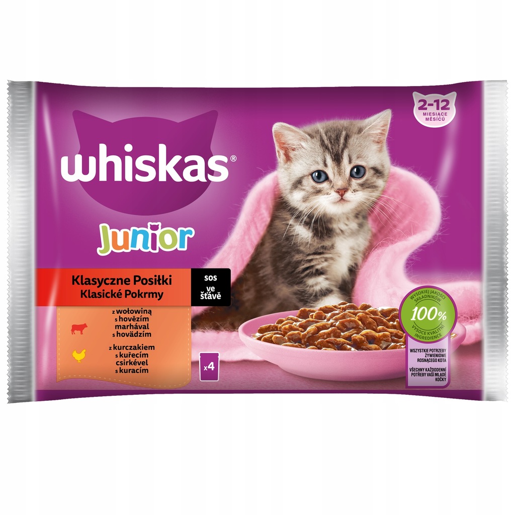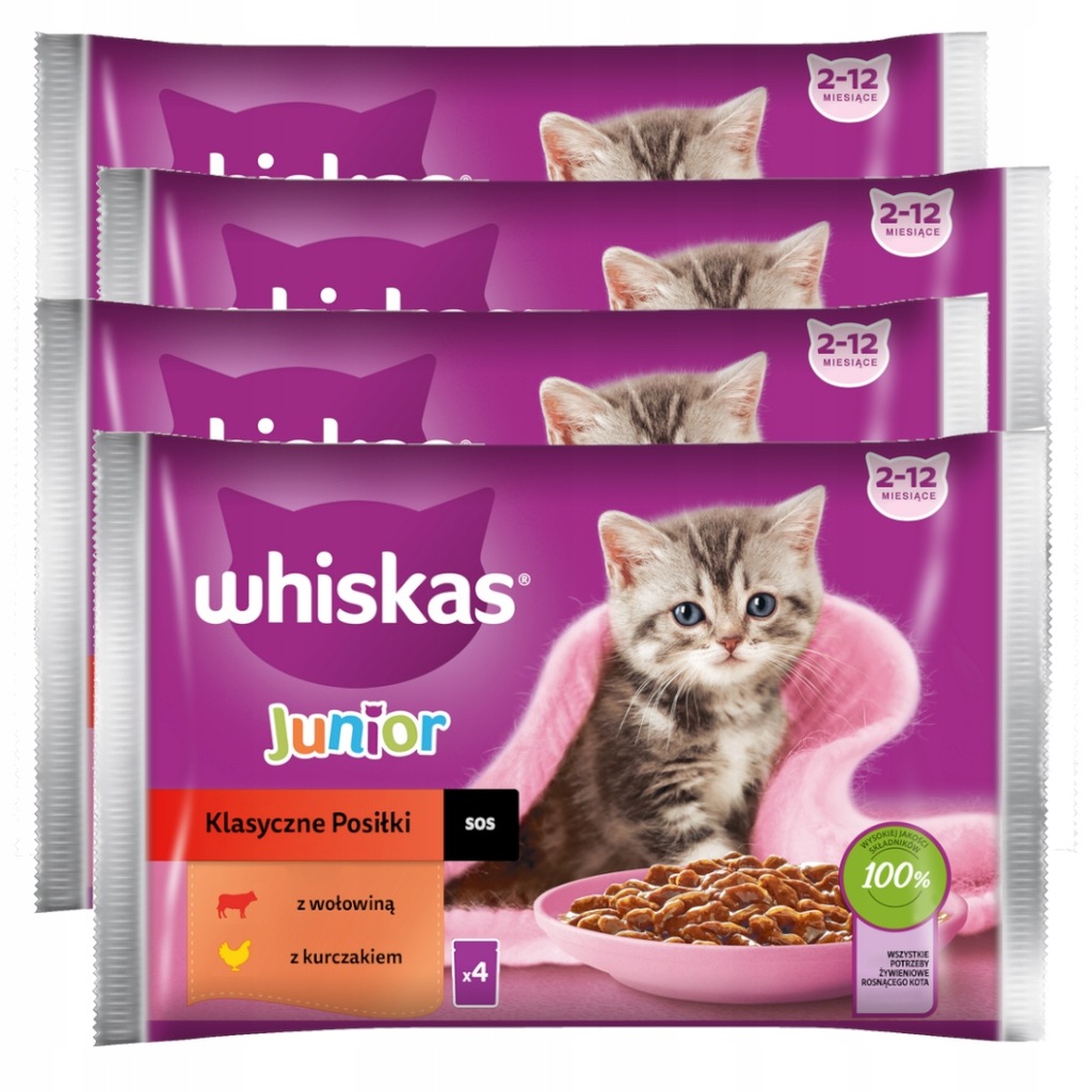 Pełnoporcjowa karma mokra dla kociąt Whiskas Junior Klasyczne Posiłki w Sosie to zestaw starannie przygotowanych, kompletnych i zbilansowanych karm mokrych dla kociąt. Zestaw zawiera saszetki w 2 różnych smakach: z kurczakiem oraz wołowiną. Mokra karma Whiskas Junior została specjalnie opracowana, aby dostarczyć małemu kotu wszystko czego potrzebuje, by wyrosnąć na zdrowego i silnego kota.