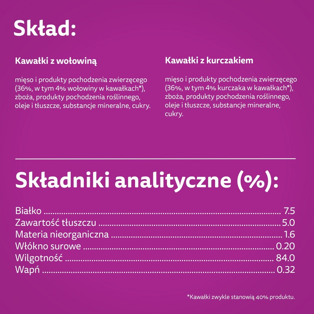 Skład z wołowiną: mięso i produkty pochodzenia zwierzęcego (36%, w tym 4% wołowiny w kawałkach*), zboża, produkty pochodzenia roślinnego, oleje i tłuszcze, substancje mineralne, cukry. *Kawałki zwykle stanowią 43% produktu.