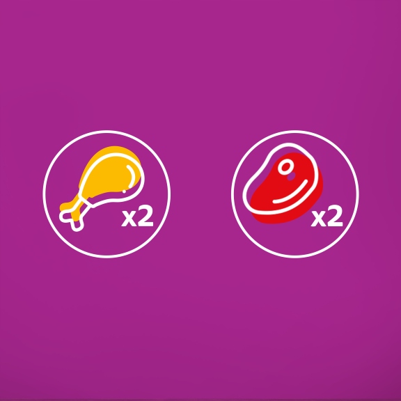 Skład z kurczakiem: mięso i produkty pochodzenia zwierzęcego (36%, w tym 4% kurczaka w kawałkach*), zboża, produkty pochodzenia roślinnego, oleje i tłuszcze, substancje mineralne, cukry. *Kawałki zwykle stanowią 43% produktu.