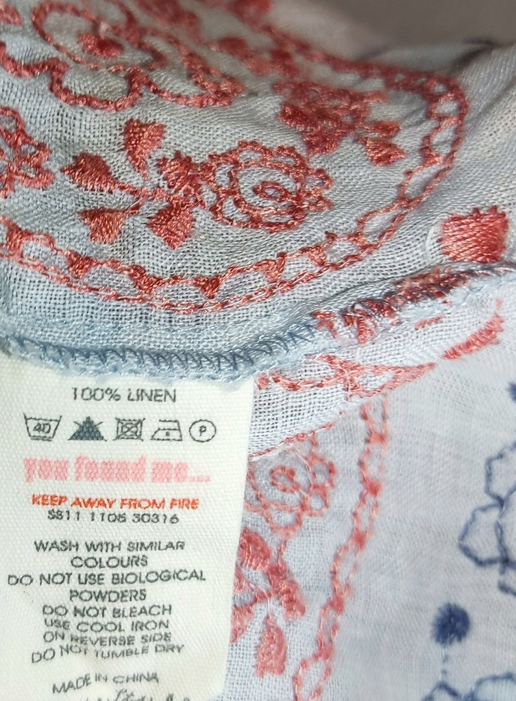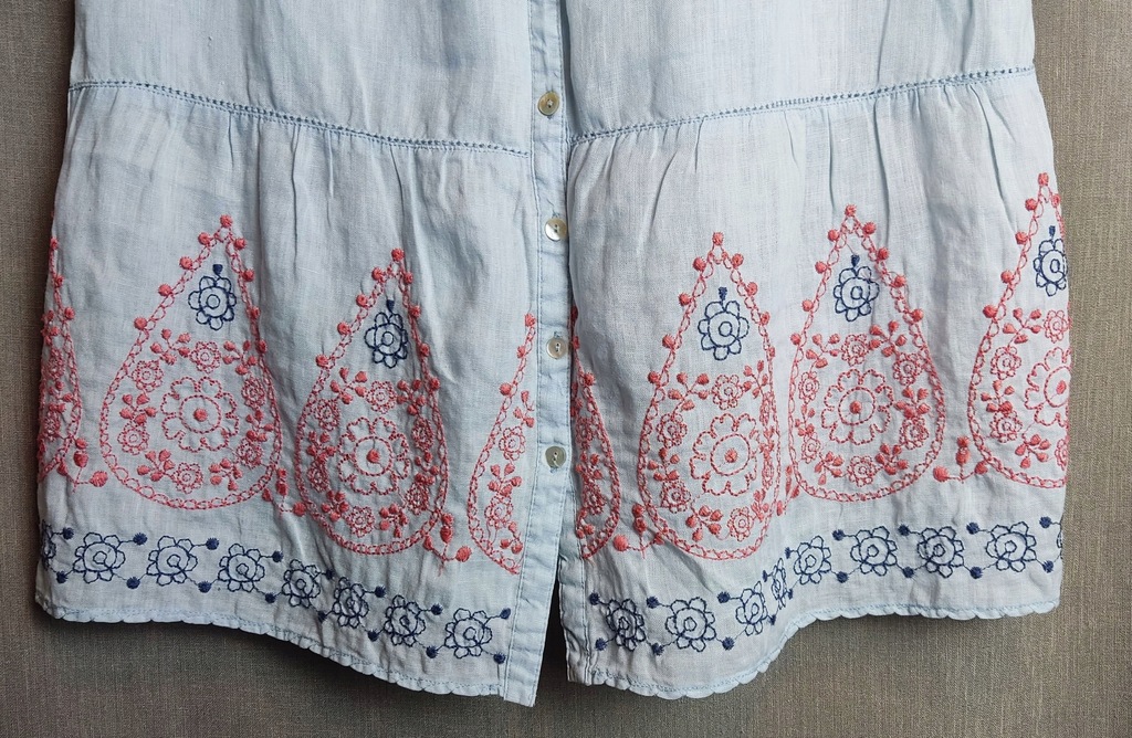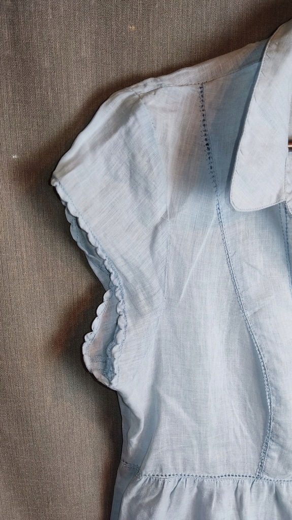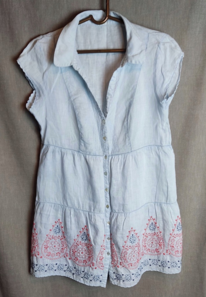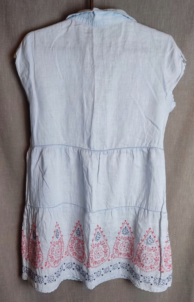 Tunika, sukienka uszyta z błękitnego lnu. Na dole wyszywana, zapinana na całej długości na perłowe guziki. krótkie rękawki zapinane na mały guziczek. Sukienka idealna na upalne dni lata