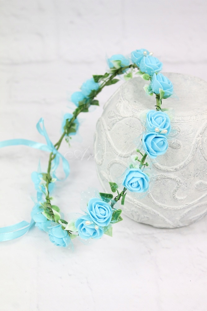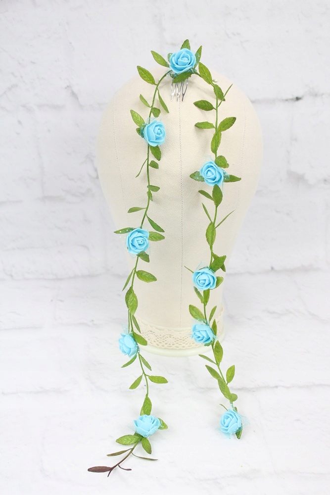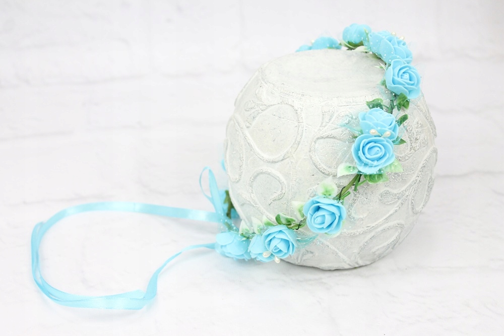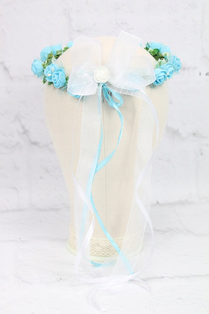 Dodatkowo jest możliwość do wianuszka dokupić szyfonową kokardkę z różą na grzebyku lub girlandę z kwiatami również na grzebyku, można je wpiąć ją w tył wianuszka by był bardziej okazały.
