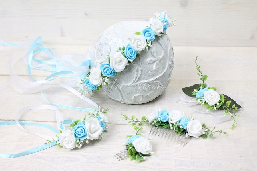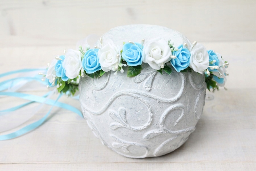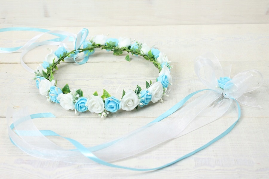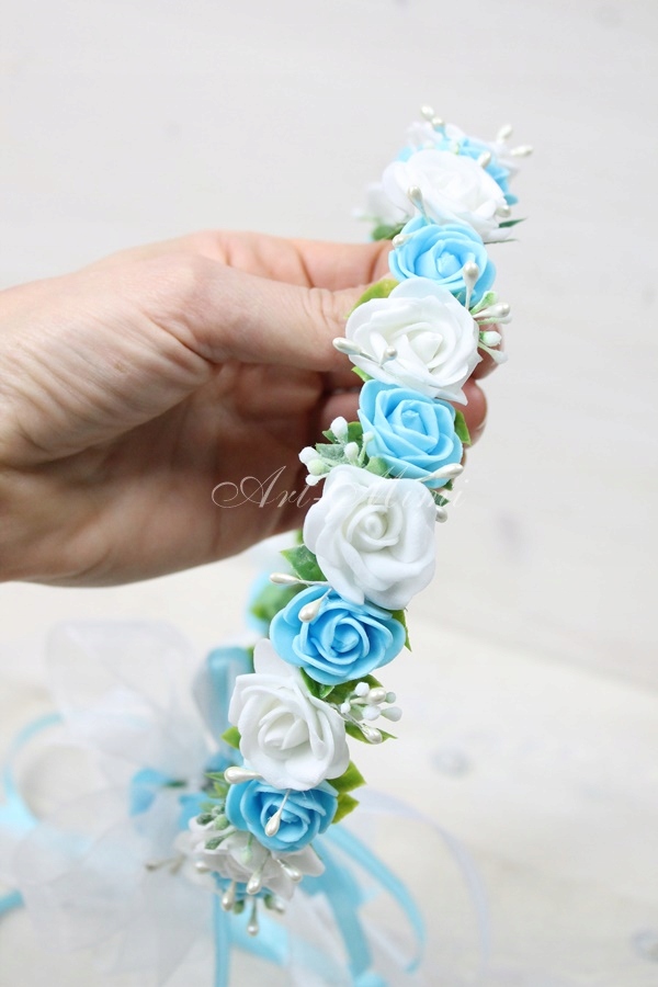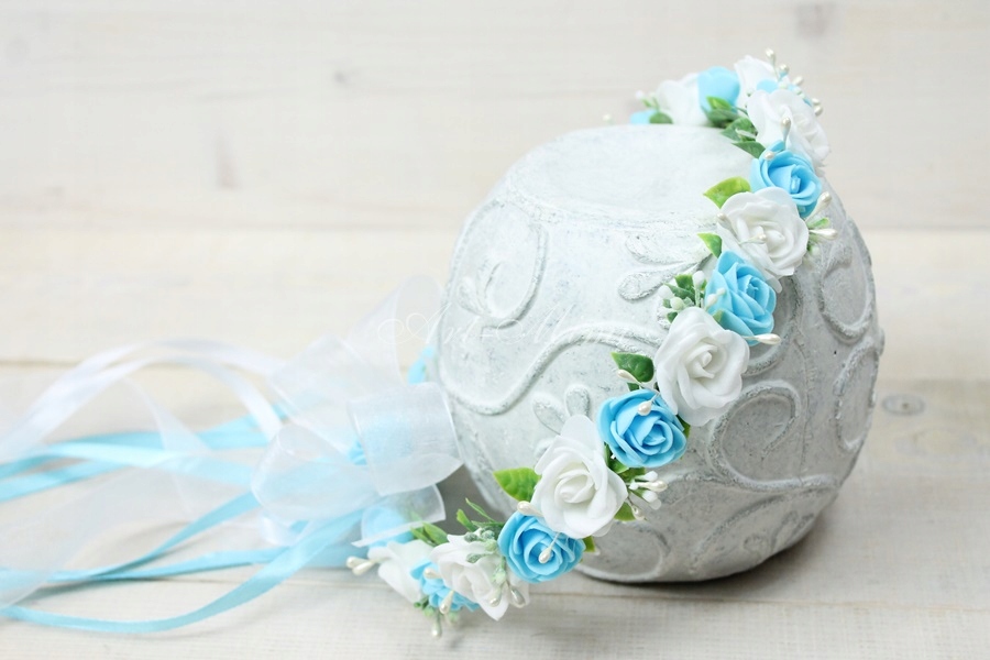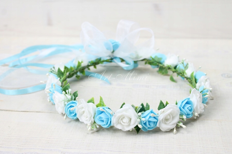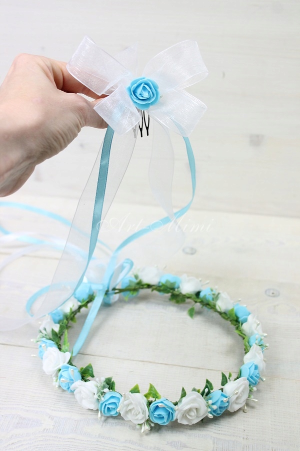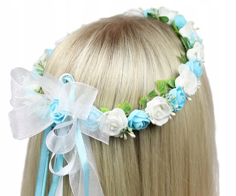 Wyjątkowo piękny wianek komunijny, pełen niebieskich i białych różyczek, zdobiony listkami bluszczu które swoim kształtem przypominają serduszka, pręcikami perłowych perełek oraz dekoracyjną trawą.