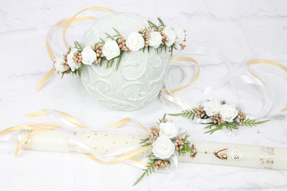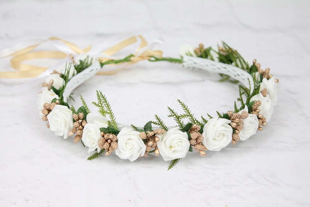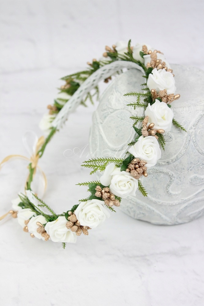 Subtelny i uroczy wianek komunijny, pełen białych kwiatów róży, zdobiony pęczkami perełek w kolorze złotym, gałązkami paproci oraz wstążkami dopasowanym kolorystycznie do wianka.