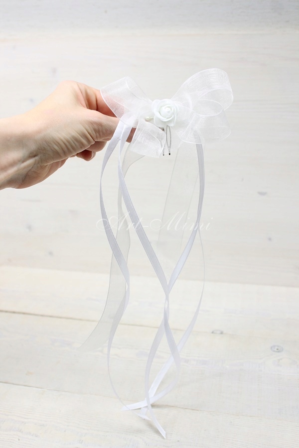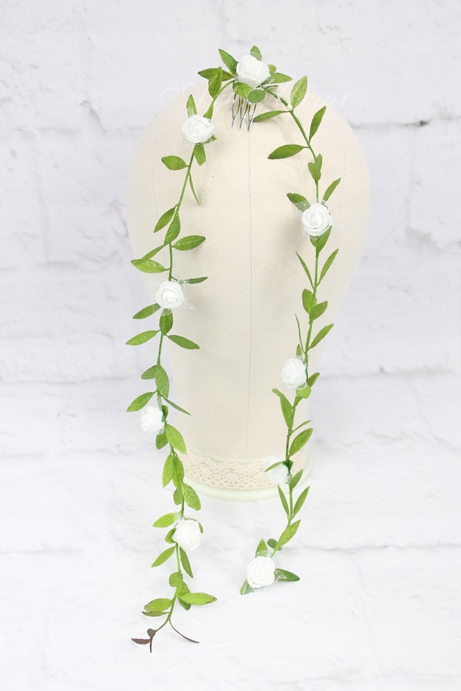 Dodatkowo jest możliwość do wianuszka dokupić szyfonową kokardkę z różą na grzebyku lub girlandę z kwiatami również na grzebyku, można je wpiąć ją w tył wianuszka by był bardziej okazały.