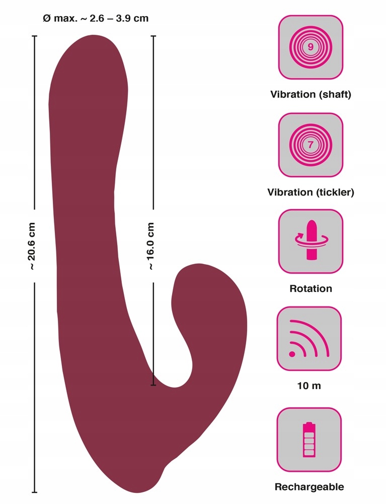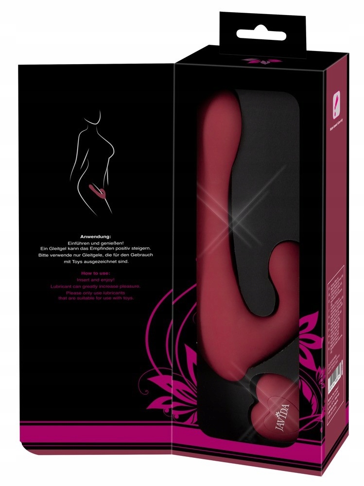 Aksamitnie jedwabisty wibrator marki Javida zapewnia intensywną stymulację pochwy i łechtaczki: wibrujący trzon intensywnie masuje punkt G za pomocą obracającej się główki - w tym samym czasie elastyczny stymulator łechtaczki rozpieszcza wibracjami. Wszystko można wygodnie kontrolować za pomocą stylowego pilota w kształcie serduszka! 2 ciche jak szept, ale mocne silniki zapewniają 9 trybów wibracji i rotacji w wale oraz 7 trybów wibracji w stymulatorze łechtaczki. Funkcjami można sterować oddzielnie lub łączyć je ze sobą w ekscytujący sposób. A wszystko to za naciśnięciem jednego przycisku - zasięg pilota wynosi do 10 metrów, Ładowanie za pomocą dołączonej magnetycznej ładowarki USB.