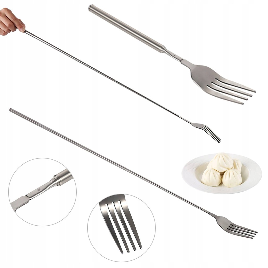 Czy kiedykolwiek czułeś, że twoje jedzenie jest zbyt gorące, a widelec jest za krótki, aby go użyć? Jeśli tak, przyjdź zobaczyć nasz nowy, wysuwany widelec z długą rączką. Długość uchwytu można regulować w zakresie od 22 do 64 cm (8,7 do 25,2 cala). Idealne sztućce do grillowania, obiadów, deserów, kiełbasek, hot-dogów, warzyw itp. Warto kupić!