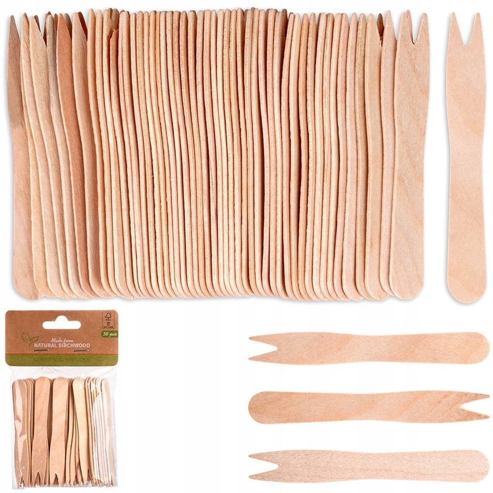 Zestaw 50 sztuk widelczyków do frytek i przekąsek. Widelczyki są jednorazowe. Wykonane z drewna są niezwykle praktyczne i przydatne podczas pikników, wypadów za miasto oraz spotkań w ogrodzie. Przyjazne dla środowiska, są najlepszą alternatywą dla widelczyków plastikowych. Wyprodukowano zgodnie z europejskimi standardami.
