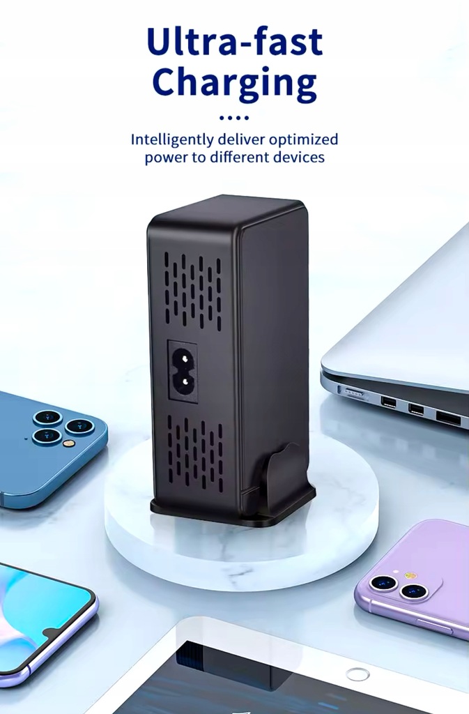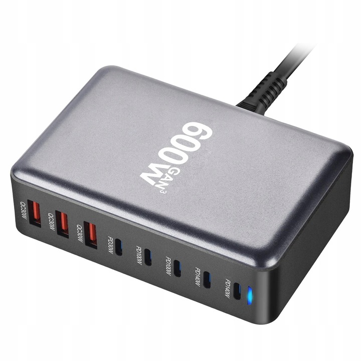 Zaawansowane urządzenie o łącznej mocy 600W, które umożliwia szybkie i bezpieczne ładowanie aż ośmiu urządzeń jednocześnie. Dzięki technologii GaN III, ładowarka zapewnia wyższą efektywność i mniejsze rozmiary, co przekłada się na szybkie, stabilne ładowanie bez przegrzewania.
