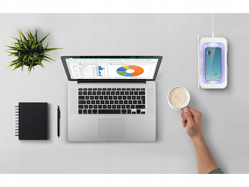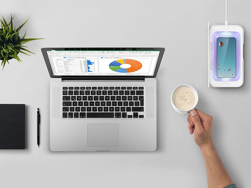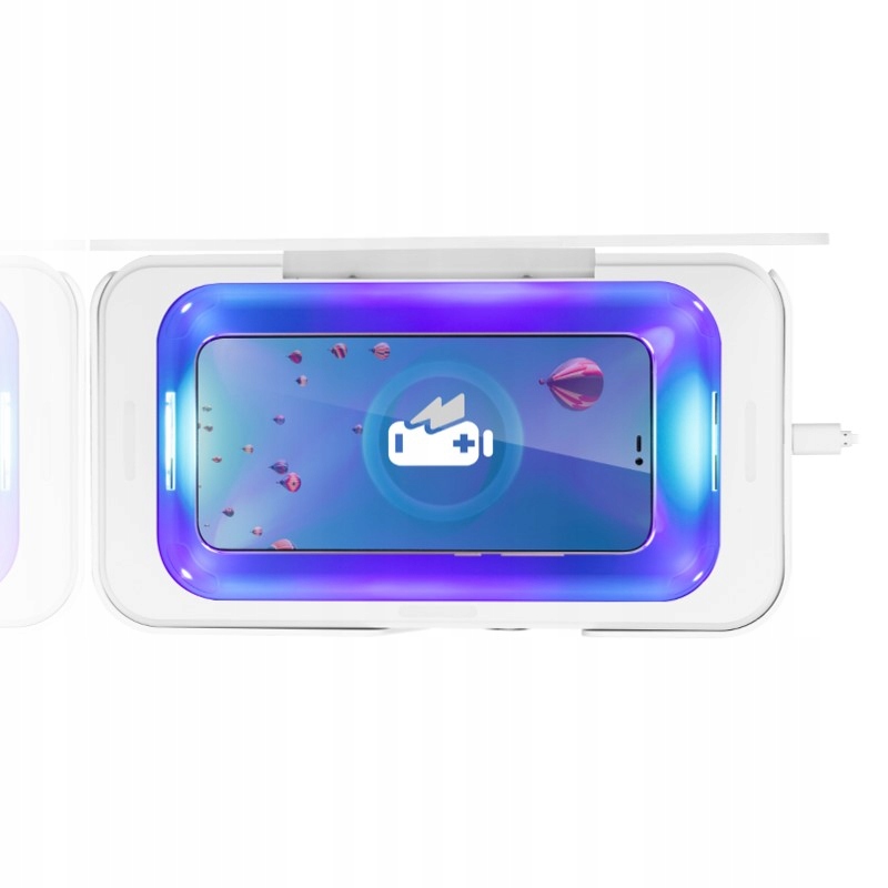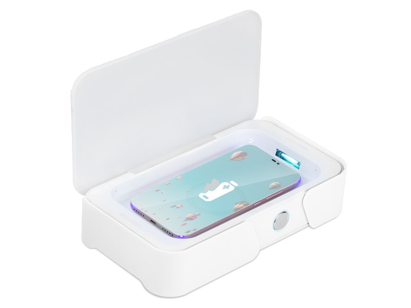 Elegancki i praktyczny sterylizator z lampą UV do telefonów komórkowych, słuchawek, kluczy i wszelkich drobiazgów osobistych. To nowoczesne urządzenie nie tylko zdezynfekuje Twój telefon, ale również posiada funkcję ładowania bezprzewodowego.