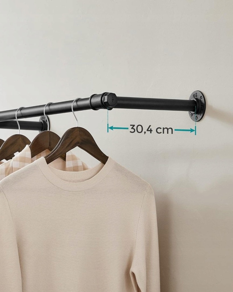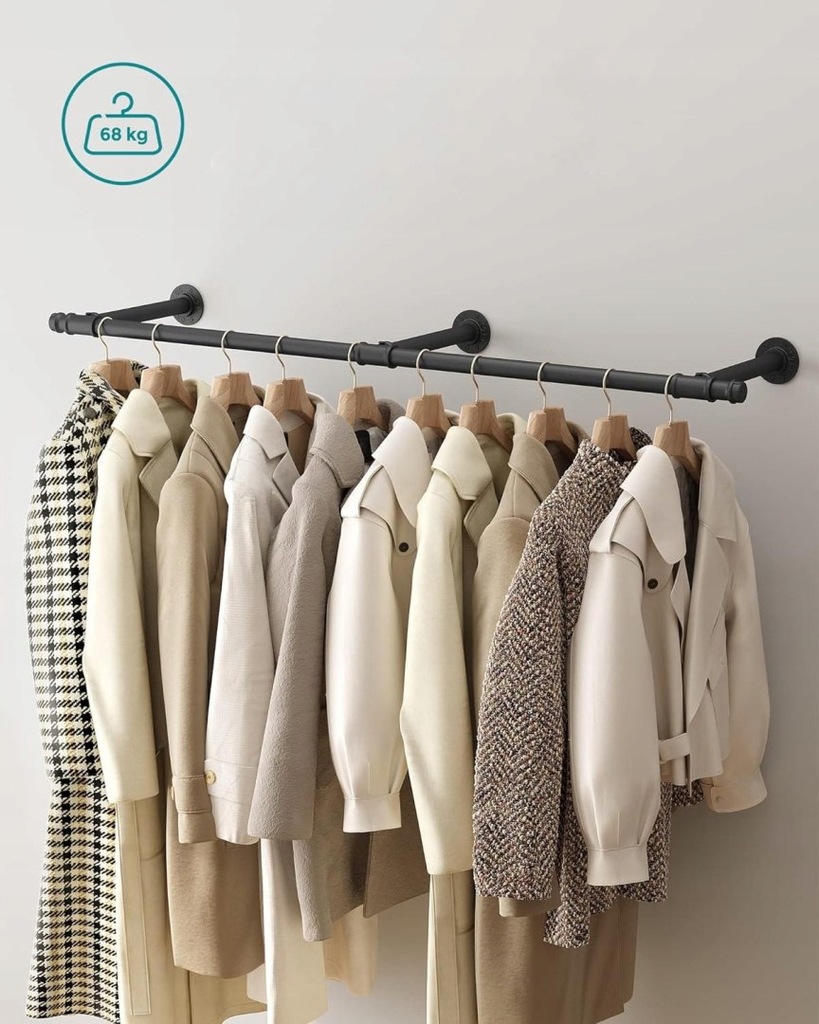 Odpowiednia odległość wieszaka od ściany sprawi, że Twoje ubrania nie pomną się ani nie ubrudzą o ścianę. Możliwość przesunięcia elementów montażowych w prawo bądź lewo ułatwia montaż wieszaka na różnego rodzaju ścianach. Pamiętaj, że podane maksymalne obciążenie drążka odnosi się do ściany z betonu bądź cegły.