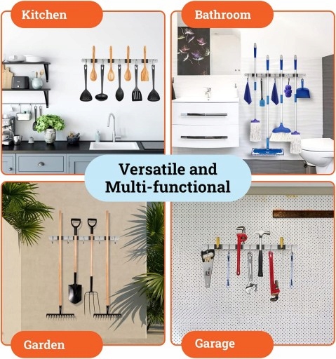 ✅ Wszechstronność zastosowania: Nasz uchwyt ścienny znajdzie zastosowanie w różnych miejscach, takich jak garaż, szopa, piwnica, warsztat czy szafki. Regulowane haki i kołki umożliwią bezpieczne zawieszenie większości narzędzi kuchennych, do sprzątania, metalowych, sportowych i garażowych. ??