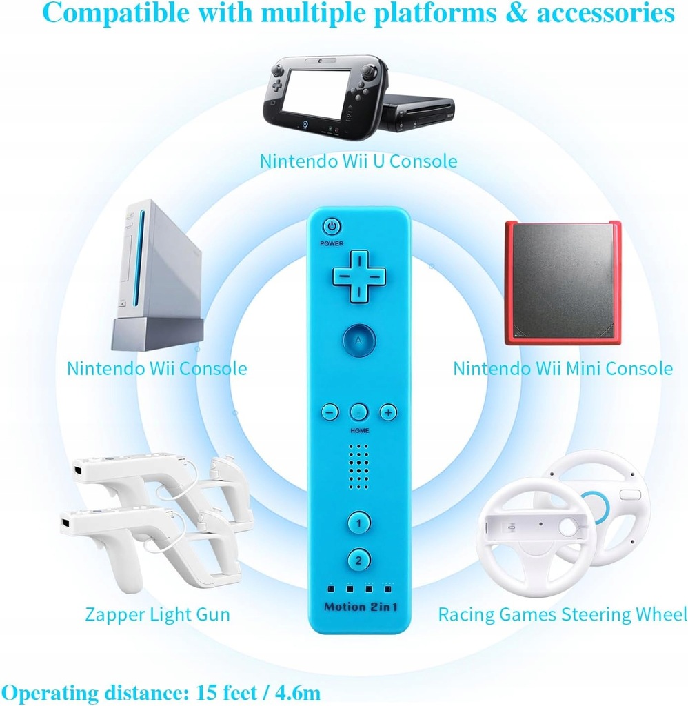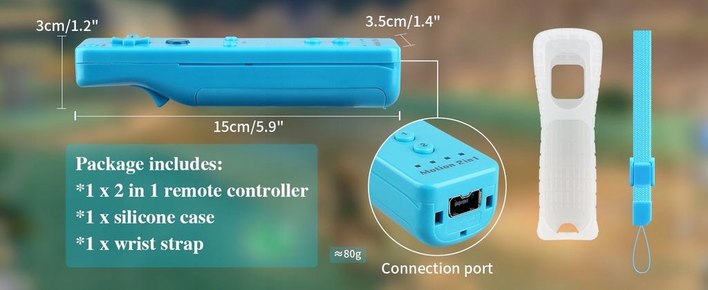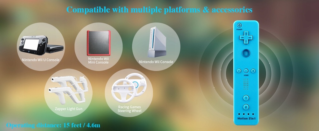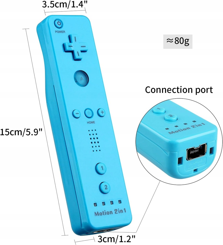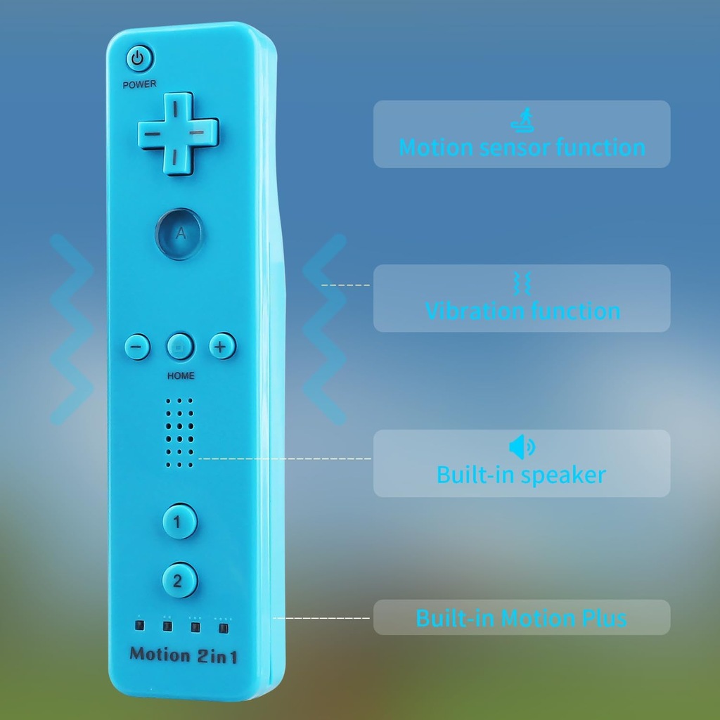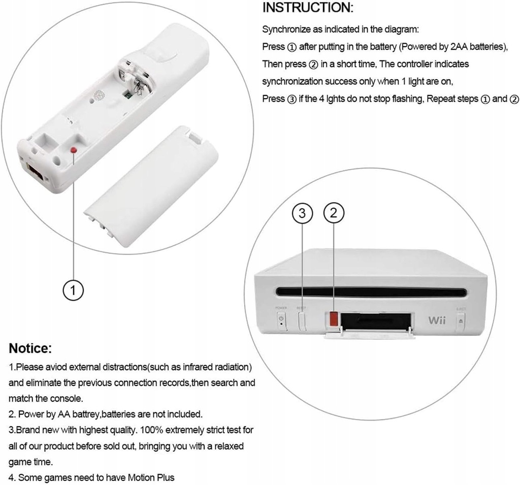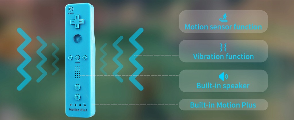 - Bezprzewodowy zamiennik: przedmiotem sprzedaży jest zamiennik kultowego kontrolera Wii Remote z dodatkiem Motion Plus (potrzebnym wyłącznie do uruchomienia kilku gier) kompatybilnego z konsolą Nintendo WII; w większości gier kontrolery z dodatkiem Motion Plus/ bez dodatku Motion Plus działają tak samo; kontroler jest zasilany bateriami AA