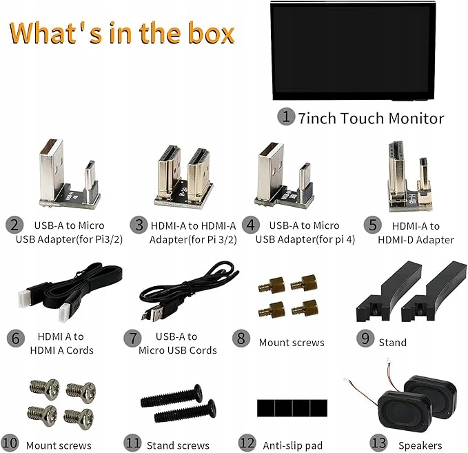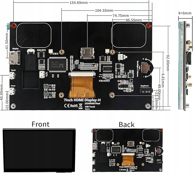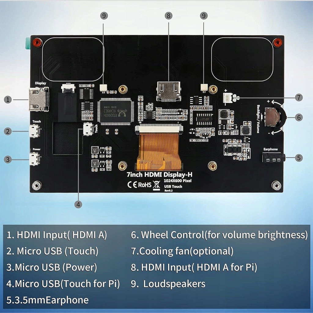 7-calowa rozdzielczość HD IPS z matrycą punktową 1024 x 600. Pełnoekranowy wyświetlacz ma duży kąt widzenia, prawdziwe kolory i doskonałą jakość obrazu. Panel dotykowy ze szkła hartowanego, twardość do 6H, trwały i odporny na zarysowania pojemnościowy ekran dotykowy, obsługuje do 5 punktów dotykowych. Wbudowany obwód wzmacniacza mocy, zewnętrzny interfejs audio 3,5 mm. Niezależny przycisk do ustawiania podświetlenia w celu dostosowania jasności podświetlenia w dowolnym momencie. mainstream - Obsługuje płyty rozwojowe, takie jak Raspberry Pi, Banana Pi i BB Black. W przypadku wyświetlacza Raspberry Pi obsługuje Raspbian, Ubuntu, Kali, Win10 IOT i inne systemy, napęd bezdotykowy, obsługuje również system Win7/Win8/Win10 jako monitor komputerowy i bezdotykowy. Te używane jako wyświetlacz konsoli do gier i obsługują PS4, XBOX360, Switch itd