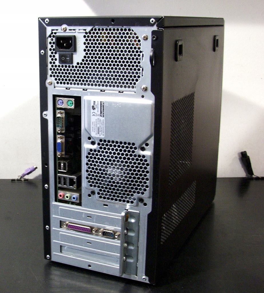 - Złącza zewnętrzne: 2xPS/2, 6xUSB (w tym 2 na przednim panelu), 2xCOM RS232, LPT, RJ45, VGA, Audio (na przednim panelu również wyjście słuchawkowe i mikrofonowe)