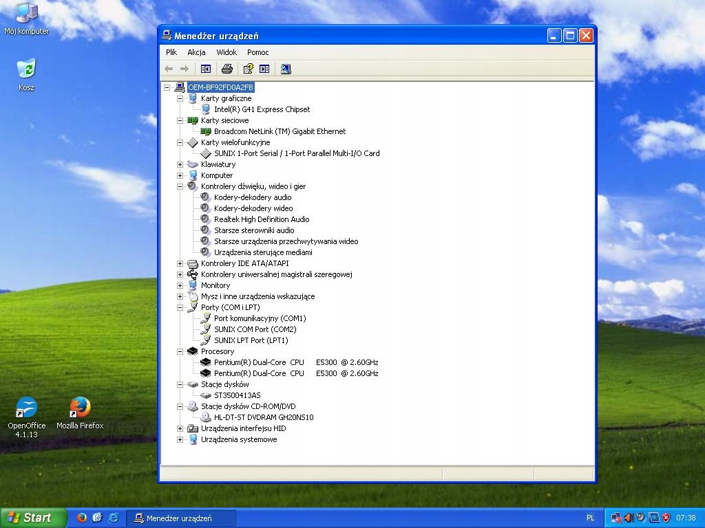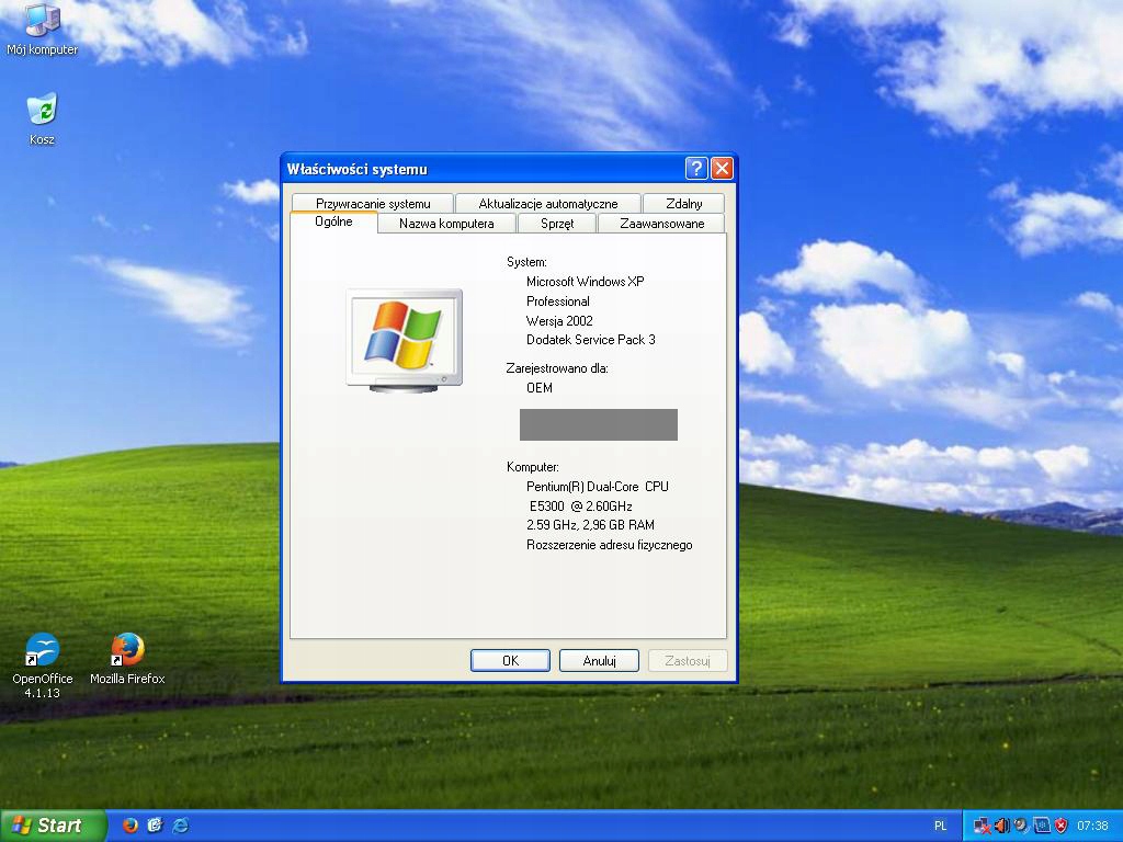 - Zainstalowany oraz skonfigurowany oryginalny Windows XP Pro PL SP3 32bit (naklejka licencyjna z kluczem na obudowie + oryginalny nośnik instalacyjny + zainstalowany dodatkowo Service Pack 3). W komplecie również płyta CD ze sterownikami. Proszę nie zwracać uwagi na pozycję "brak systemu" w parametrach produktu - systemu Windows XP nie ma do wyboru w katalogu Allegro.