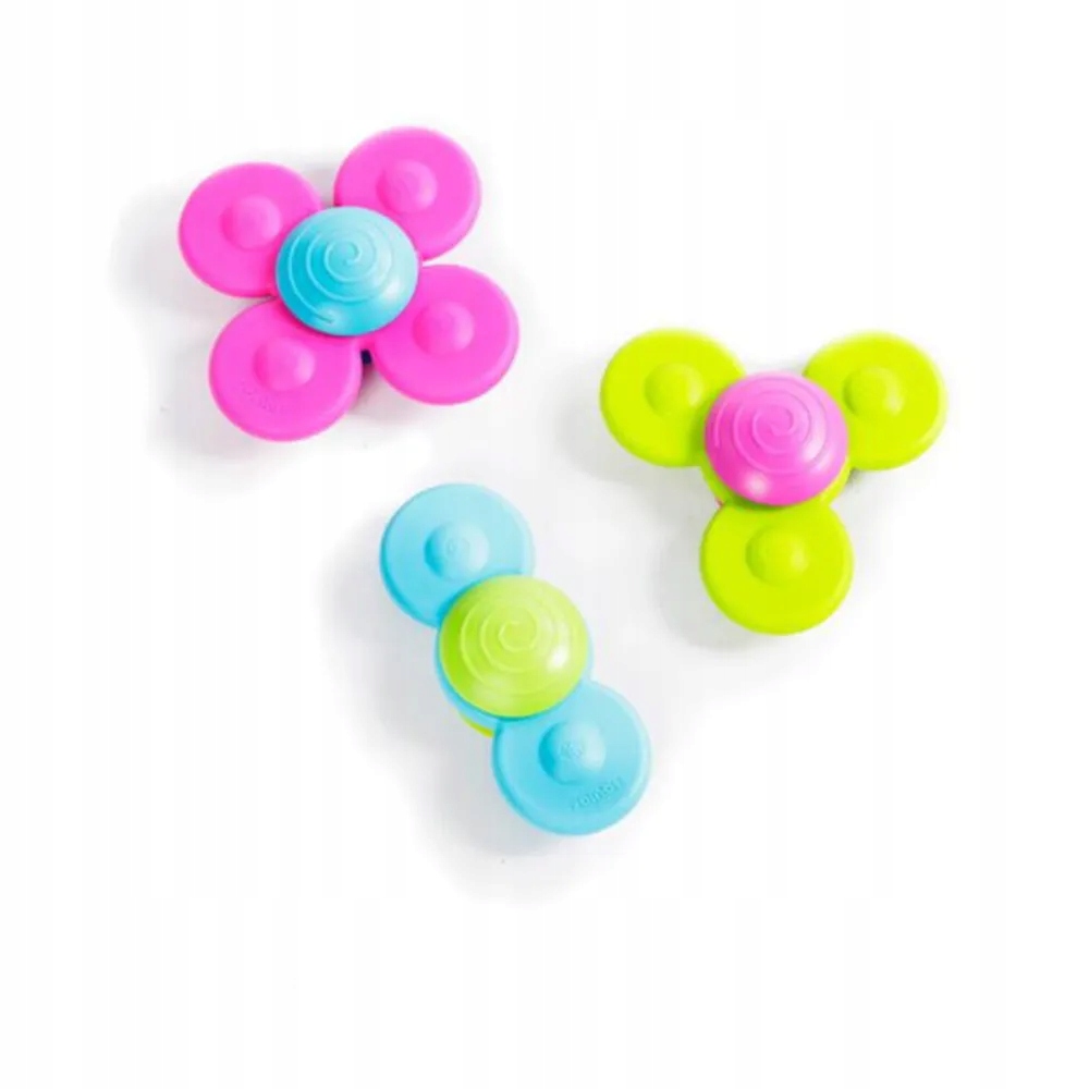 Wirujące Przyssawki Whirly Squigz to zestaw trzech silikonowych spinnerów, każdy o innej liczbie ramion. Stworzone do zabawy od najmłodszych dzieci (12 m-cy) po te starsze - przyciągają uwagę kolorystyką, hipnotyzującym ruchem, przyjemnym w dotyku materiałem oraz możliwościami zabawy.