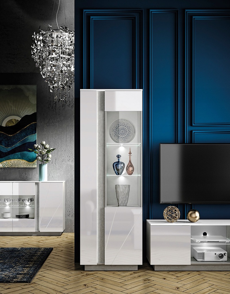 Moda na nowoczesne i jasne aranżacje wnętrz nie przemija. Odbijający światło mebel rozjaśni pomieszczenie i wniesie powiew świeżości do każdego salonu. Kolekcja LUMENS dedykowana jest osobom lubiącym niebanalne rozwiązania. Wyjątkowy charakter mebli pomoże stworzyć wysmakowane i ciekawe wnętrze. Wizytówką kolekcji LUMENS jest dobór kolorów i faktur. Połączenie błyszczących, białych frontów z matowym, betonowym korpusem to kwintesencja nowoczesnego wzornictwa. Proste bryły wzbogaciliśmy o frezowane drzwiczki. To rozwiązanie dodało bryłom lekkości i elegancji. W myśl teorii minimalizmu uchwyty zastąpiliśmy nowoczesną technologią - push to open. Industrialna, betonowa wstawka rozjaśniona na całej wysokości białym, ledowym światłem sprawia, że mebel staje się jeszcze bardziej wyjątkowy.