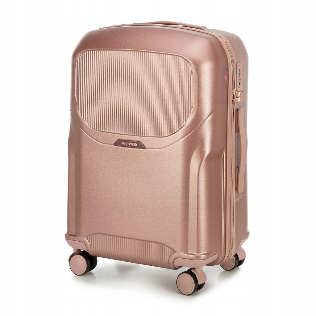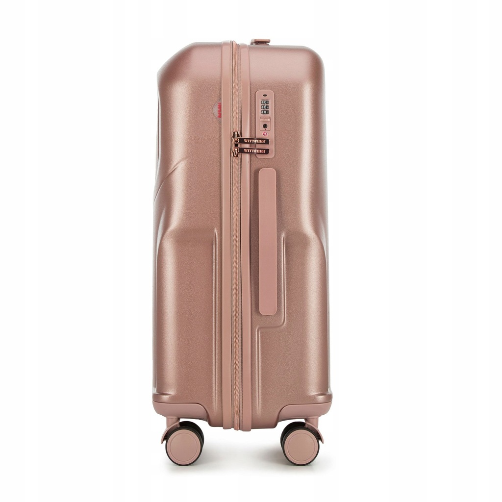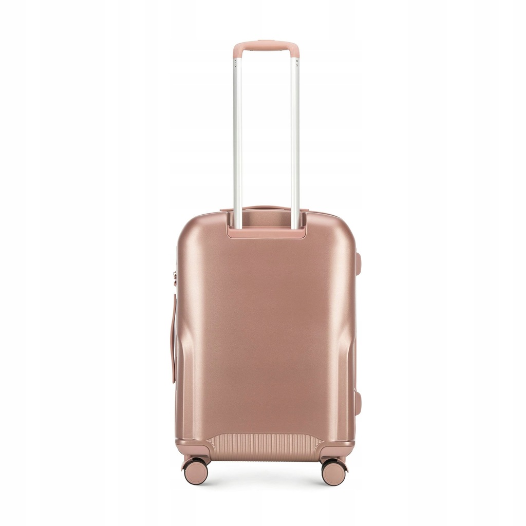 Zestaw walizek z kosmetyczką. Trzy stylowe walizki w komplecie z kosmetyczką , wykonane z wytrzymałego polikarbonu zwracają uwagę wyjątkowym designem ze żłobieniami i suwakami w kolorze różowego złota . Wewnątrz każdej znajdują się dwie komory : jedna zapina się na suwak, drugą zabezpieczają pasy zamykane na klamrę. Walizki mają cztery podwójne kółka , dzięki czemu są bardzo zwrotne, kosmetyczkę możesz nosić w ręku lub doczepić regulowany pasek. Dodatkowo każda z trzech walizek zapinana jest na zamek z systemem TSA, który zadba o bezpieczeństwo Twojego bagażu. Ten komplet walizek z polikarbonu z suwakiem w kolorze różowego złota to świetny wybór dla każdej osoby, która lubi podróżowanie w wyjątkowym stylu. Nasza rada : ten zestaw walizek to idealna propozycja dla osób lubiących podróżowanie w spójnym i eleganckim stylu. każda walizka wyposażona jest w cztery podwójne kółka ułatwiające prowadzenie; aluminiowa teleskopowa rączka oraz uchwyt z tworzywa ułatwiający przenoszenie bagażu; zamek z systemem TSA, bardzo przydatny w przypadku rewizji bagażu przez służby celne –gwarantuje on bezinwazyjne otwarcie walizki oraz jej ponowne zamknięcie bez uszkodzenia zamka; wnętrze podzielone na dwie części: komora główna z pasami zamykanymi na klamrę, zabezpieczającymi ubrania przed przemieszczaniem; komora zapinana na suwak z kieszenią z siatki zamykaną na suwak; pośrodku mała kieszeń zamykana na suwak. Kosmetyczka ma dodatkowo: z tyłu elastyczny pas umożliwiający mocowanie na rączce walizki; odpinany, regulowany pasek; podstawę zabezpieczoną nóżkami. W skład kompletu wchodzą: mała walizka na kółkach: 56-3P-131; średnia walizka na kółkach: 56-3P-132; duża walizka na kółkach: 56-3P-133; kosmetyczka podróżna: 56-3P-134. Podane wymiary obejmują również elementy wystające, takie jak rączki czy kółka.Wymiary są przybliżone i mogą się różnić +/- 5%.