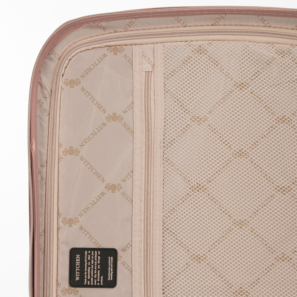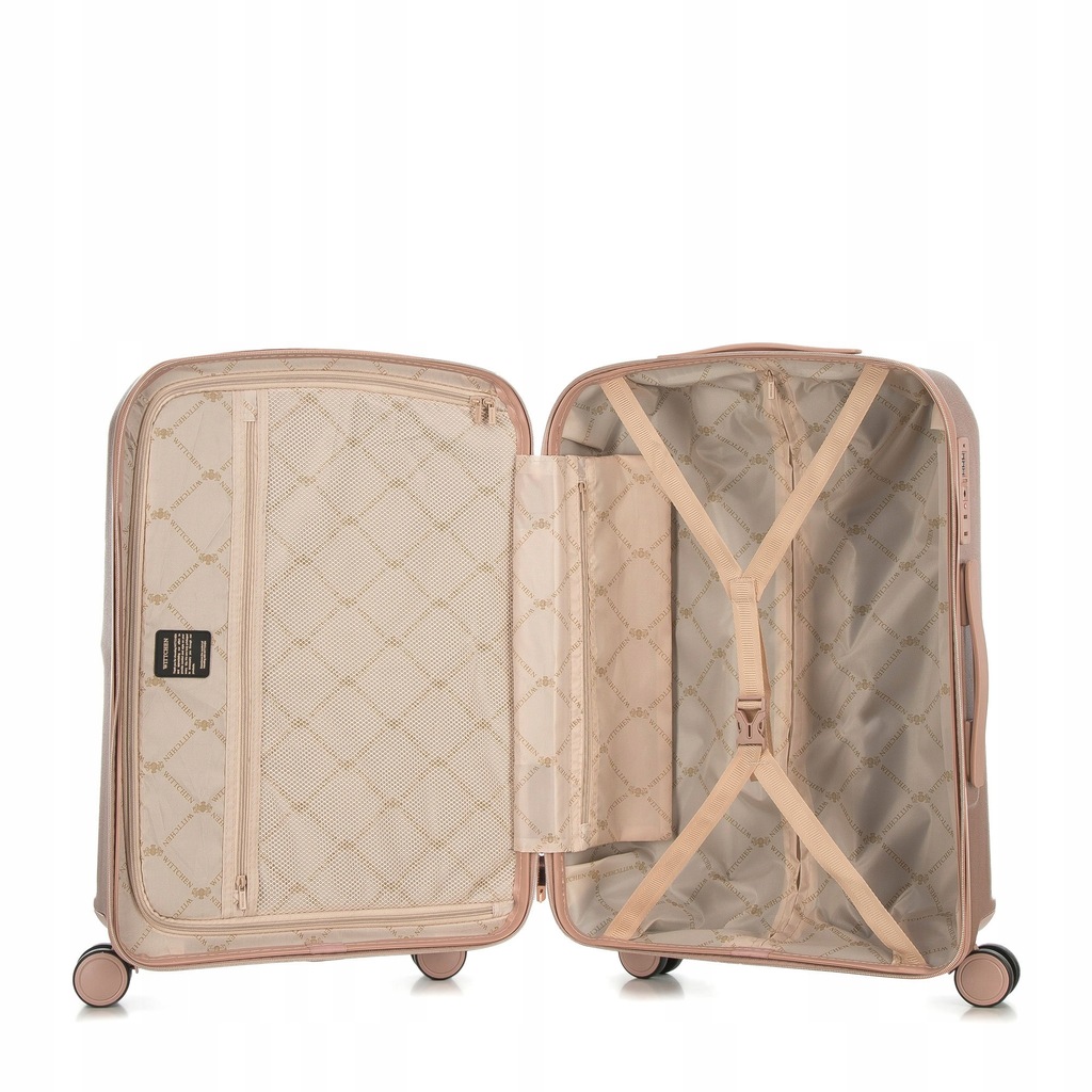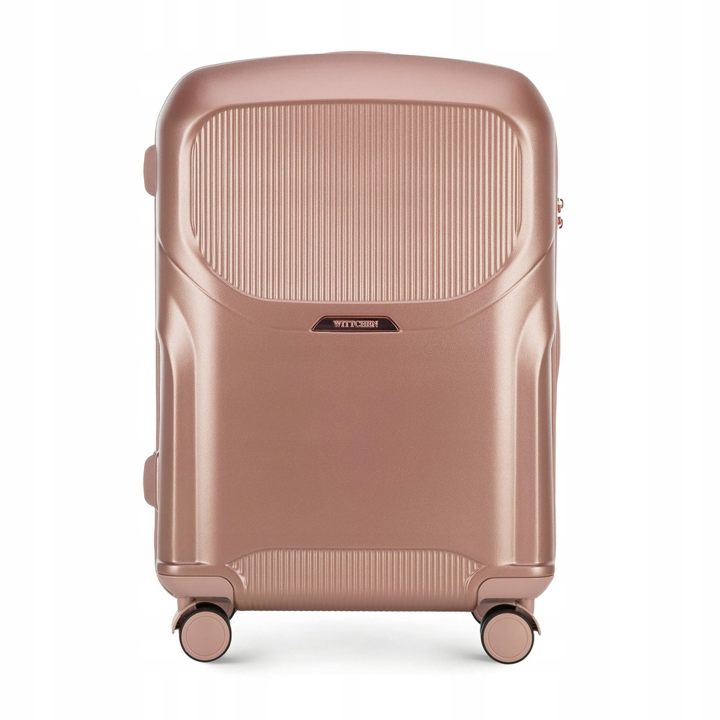 Zestaw walizek z kosmetyczką. Trzy stylowe walizki w komplecie z kosmetyczką , wykonane z wytrzymałego polikarbonu zwracają uwagę wyjątkowym designem ze żłobieniami i suwakami w kolorze różowego złota . Wewnątrz każdej znajdują się dwie komory : jedna zapina się na suwak, drugą zabezpieczają pasy zamykane na klamrę. Walizki mają cztery podwójne kółka , dzięki czemu są bardzo zwrotne, kosmetyczkę możesz nosić w ręku lub doczepić regulowany pasek. Dodatkowo każda z trzech walizek zapinana jest na zamek z systemem TSA, który zadba o bezpieczeństwo Twojego bagażu. Ten komplet walizek z polikarbonu z suwakiem w kolorze różowego złota to świetny wybór dla każdej osoby, która lubi podróżowanie w wyjątkowym stylu. Nasza rada : ten zestaw walizek to idealna propozycja dla osób lubiących podróżowanie w spójnym i eleganckim stylu. każda walizka wyposażona jest w cztery podwójne kółka ułatwiające prowadzenie; aluminiowa teleskopowa rączka oraz uchwyt z tworzywa ułatwiający przenoszenie bagażu; zamek z systemem TSA, bardzo przydatny w przypadku rewizji bagażu przez służby celne –gwarantuje on bezinwazyjne otwarcie walizki oraz jej ponowne zamknięcie bez uszkodzenia zamka; wnętrze podzielone na dwie części: komora główna z pasami zamykanymi na klamrę, zabezpieczającymi ubrania przed przemieszczaniem; komora zapinana na suwak z kieszenią z siatki zamykaną na suwak; pośrodku mała kieszeń zamykana na suwak. Kosmetyczka ma dodatkowo: z tyłu elastyczny pas umożliwiający mocowanie na rączce walizki; odpinany, regulowany pasek; podstawę zabezpieczoną nóżkami. W skład kompletu wchodzą: mała walizka na kółkach: 56-3P-131; średnia walizka na kółkach: 56-3P-132; duża walizka na kółkach: 56-3P-133; kosmetyczka podróżna: 56-3P-134. Podane wymiary obejmują również elementy wystające, takie jak rączki czy kółka.Wymiary są przybliżone i mogą się różnić +/- 5%.