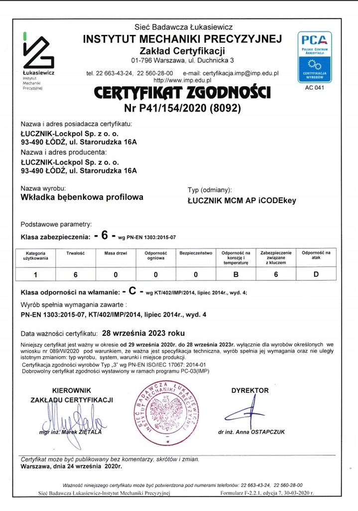 Trwałość: 100 tys. cykli Zabezpieczenie: Klasa 6 najwyższa Odporność na atak: Klasa D najwyższa Odporność na włamanie: Klasa C najwyższa