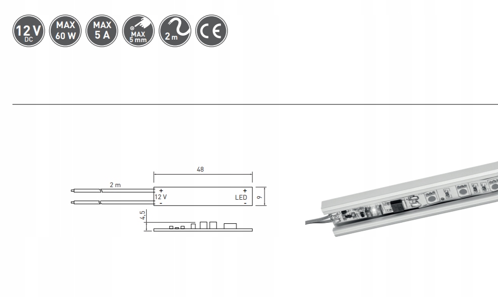 Włącznik bezdotykowy do montowania wewnątrz profilu. Włącznik wyposażony jest w przewód zasilający o długości 2 metrów. Obsługuje odcinki taśmy o mocy nie większej niż 60W. Nie posiada funkcji ściemniania. Gotowość do pracy sygnalizuje niebieska dioda. Ułatwia ona także odnalezienie włącznika nocą. Nie należy podłączać włącznika pod napięciem. Pierwsze uruchomienie powinno nastąpić przy założonej osłonce.