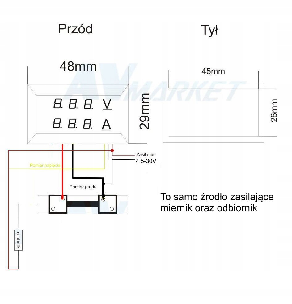 Uwaga: Podłączenie napięcia zasilania miernika do przewodów kostki 2 - przewodowej powoduje zniszczenie miernika. Zasilanie miernika podłącza się do kostki 3 - przewodowej (cienkie przewody). Prostowniki, ładowarki, czy regulatory PWM nie są źródłami napięcia stałego DC. W przypadku stosowania miernika w tego typu źródłach zasilania należy zastosować układy wygładzające napięcie np. kondensator filtrujący na zasilaniu miernika.