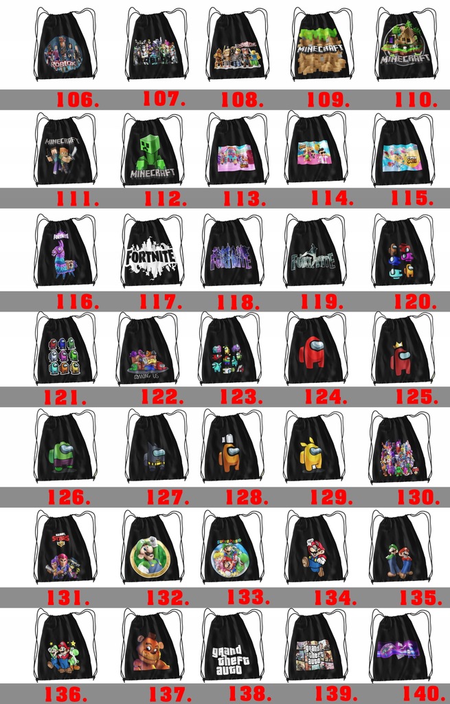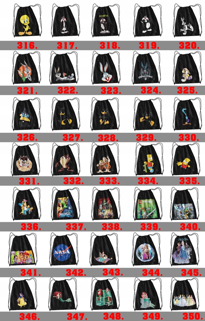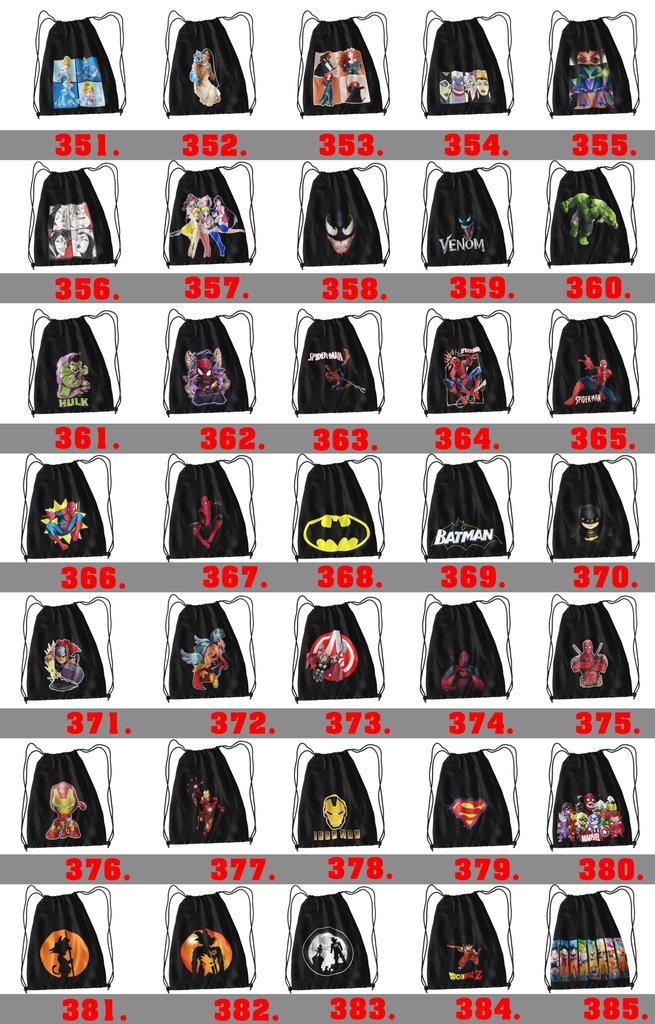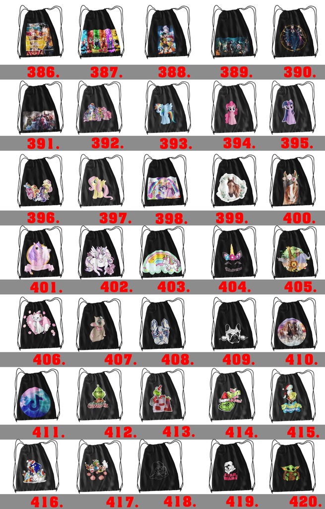 Jeżeli jednak interesuje cię worek z grafik poniżej:PAMIETAJ przy zakupie w wiadomości do sprzedającego(PRZY ZAMÓWIENIU) napisz numer wzoru jaki mamy wykonać.