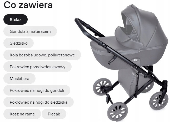 - Stelaż z gondolą: 105(dł)x60(szer)x121(w) cm, waga: 13,8 kg (wcześniej 15,25 kg)