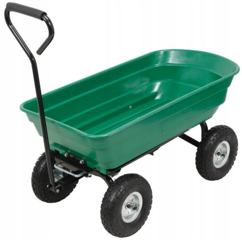 Lekki, zwrotny wózek przeznaczony do transportu w ogrodze i wokół domu. Pojemnik z odpornego na zużycie i warunki zewnętrzne polipropylenu PP.