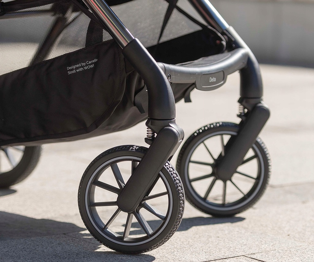 Wózek spacerowy Carrello Delta został wyposażony w solidne, gumowe koła, które są nieco większe niż standardowe koła spotykane w większości kompaktowych modeli spacerowych dostępnych na rynku.