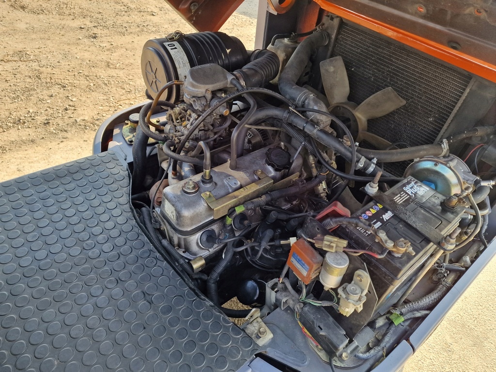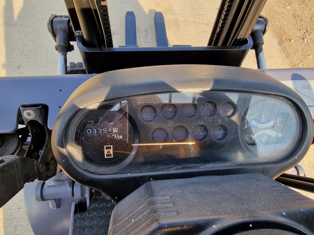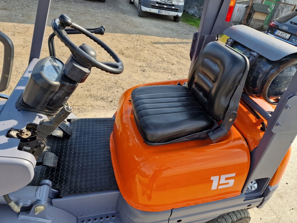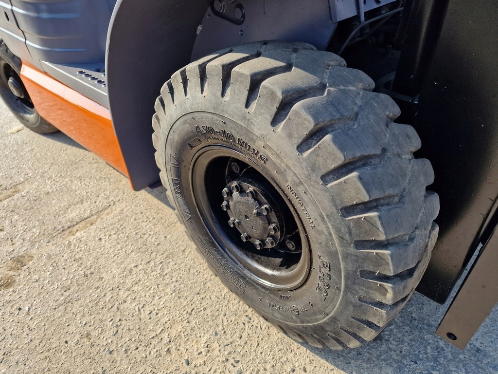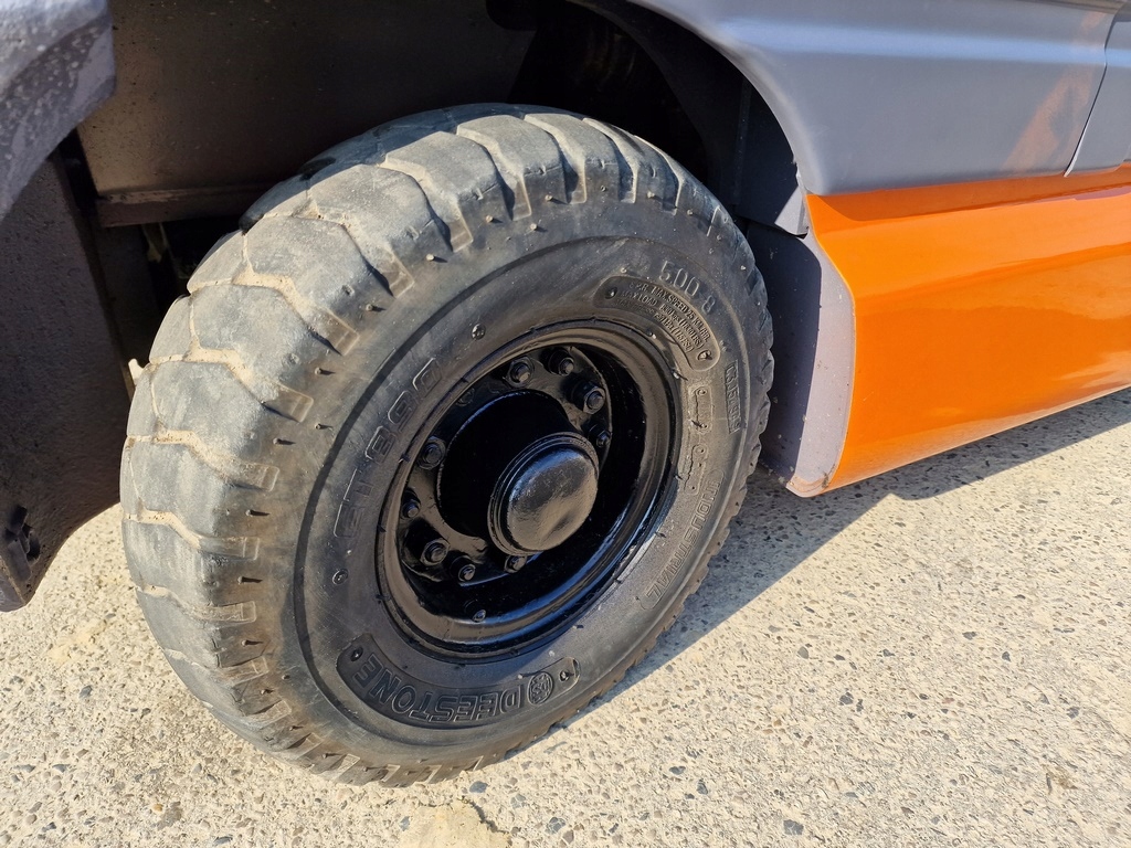 Wózek napędzany jest paliwem LPG oraz posiada przesuw boczny wideł.