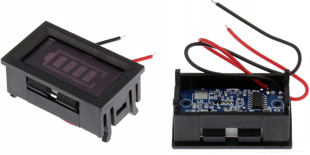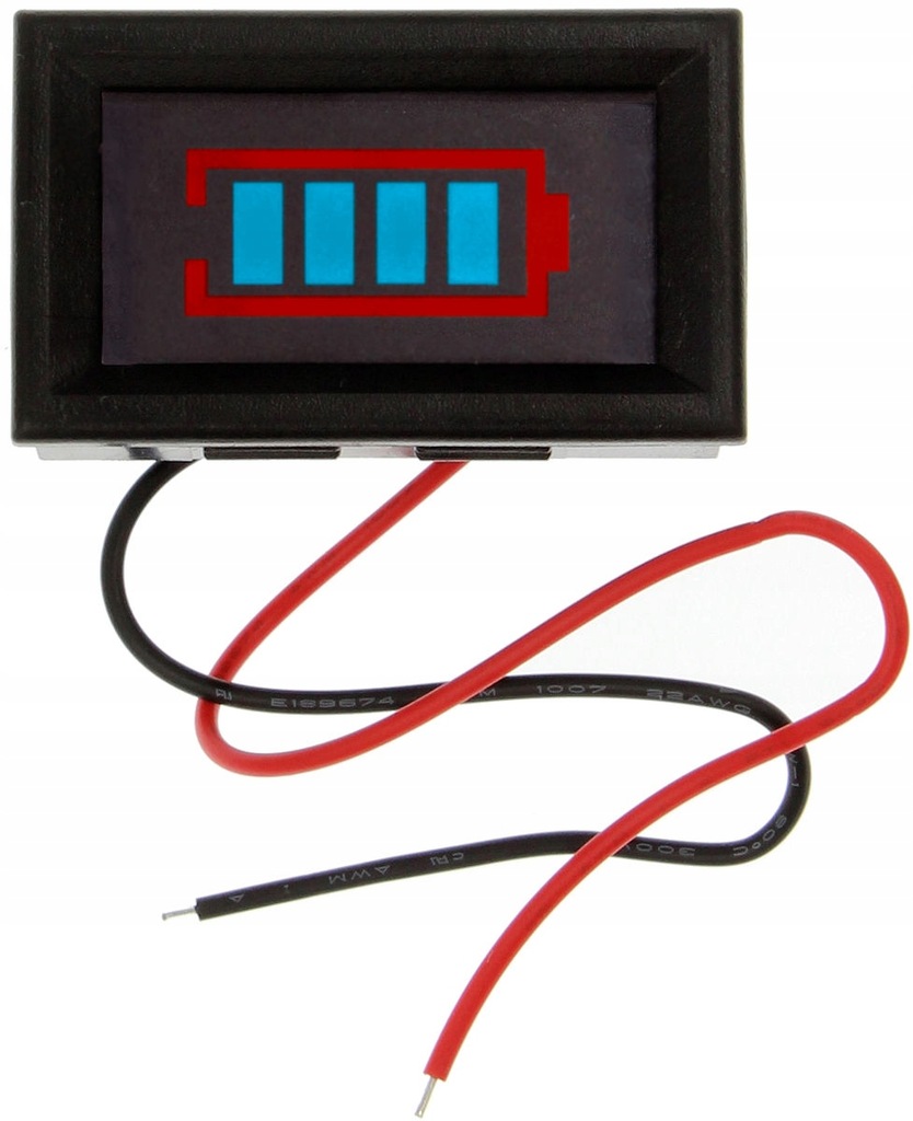 Wyświetlacz poziomu baterii wyświetla 5 poziomów naładowania baterii/akumulatorów. Oparty na układzie TM1651. Symbol baterii świeci na kolor czerwony, zaś poziom naładowania na niebiesko. Wskaźnik jest wyposażony w łapki, które utrzymują go w otworze montażowym o wymiarach od 26X45,5mm do 28,5X47,5mm. Stosowany do monitorowania poziomu naładowania np. akumulatorów żelowych czy ołowiowych.