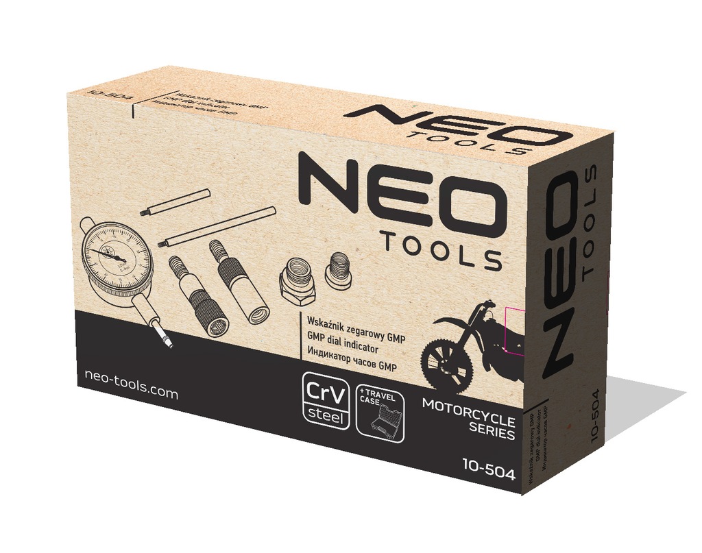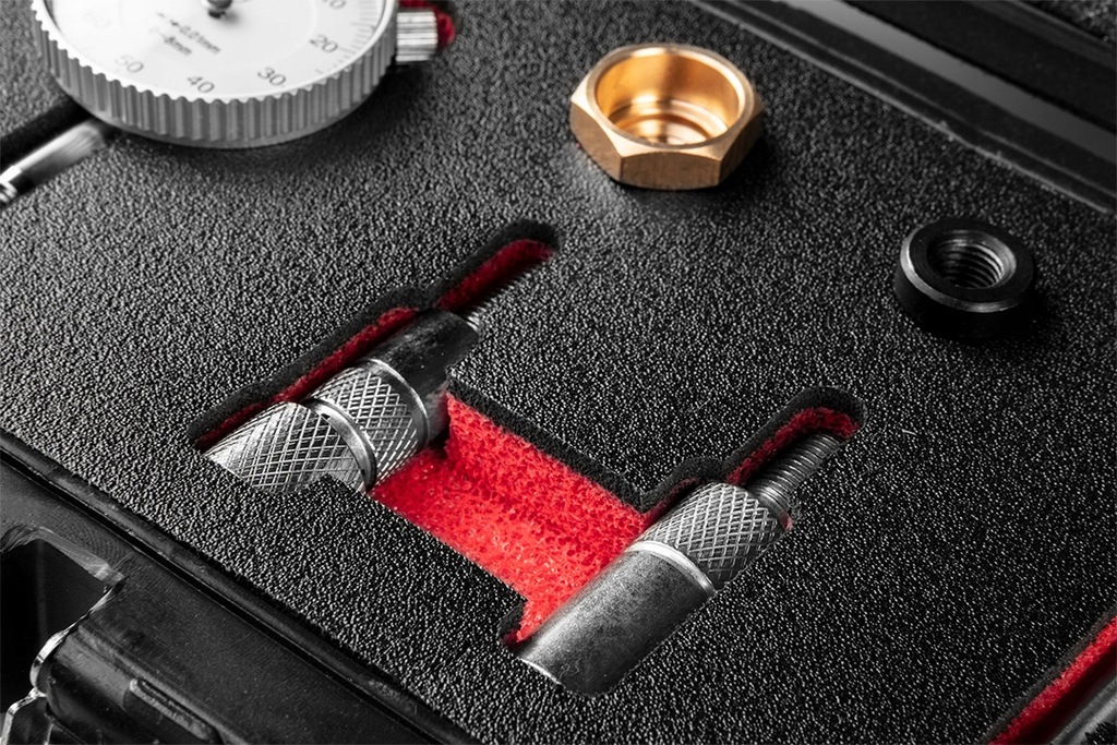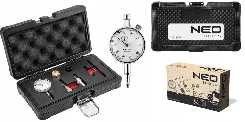 Wskaźnik zegarowy do regulacji zapłonu w motocyklach, lokalizacji GMP tłoka, umożliwia precyzyjne ustawienie czasu zapłonu, pasuje do większości głowic, przejściówka do świec zapłonowych w 10 i 14 mm, w zestawie: czujnik zegarowy + 2 przedłużki, adapter z zaciskiem pomiarowym dł. 3 cm, przedłużka M8x1.0 dł. 3 cm, adapter 2 szt. M10x1,0 i M14x1,25;