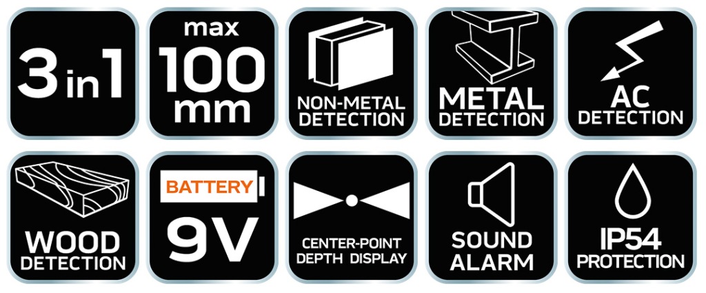 Wykrywacz z wyświetlaczem NEO (nr ref. 75-250) to cyfrowy wykrywacz 3 w 1 cechujący się precyzją pomiaru i dokładnością do +/- 10 mm. Służy do wykrywania metalu, przewodów pod napięciem oraz drewna. Przydatny przy lokalizowaniu ukrytych przewodów, kołków i drewnianych profili, metalowych rur i zbrojeń. Spełni oczekiwania majsterkowiczów jak i profesjonalistów. Posiada wbudowany sygnał dźwiękowy. Zasilany jest baterią 9V, która pozwala na pracę do 4h. W zestawie znajduje się materiałowe etui oraz bateria.