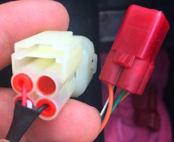 1. Znajdź 4-stykowe męskie złącze diagnostyczne w kolorze czerwonym, zwykle w pobliżu skrzynki ECU. Może to być jedna zdejmowana nasadka, częściowo pokryta czarną taśmą.