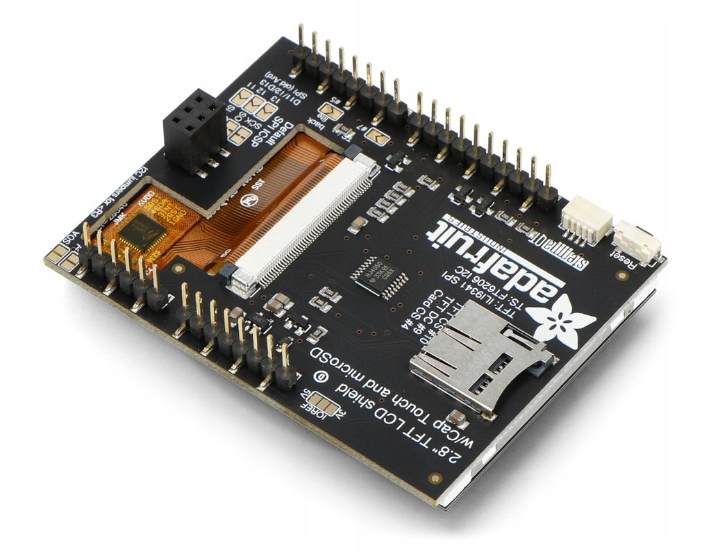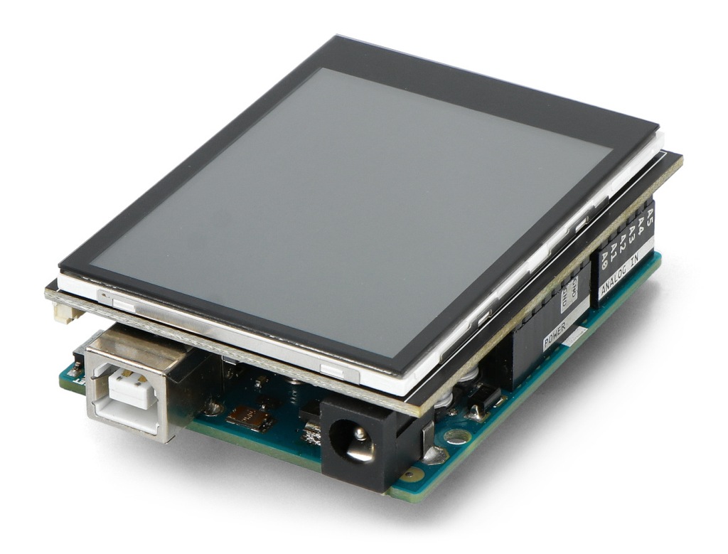 Nakładka dla Arduino z pojemnościowym ekranem dotykowym TFT. Jego przekątna wynosi 2,8", rozdzielczość jest równa 240 x 320 px. Wyświetlacz posiada podświetlenie LED i indywidualną kontrolę pikseli, wlutowane złącza, czytnik kart microSD oraz port QT. Komunikacja odbywa się za pomocą interfejsu I2C i SPI.