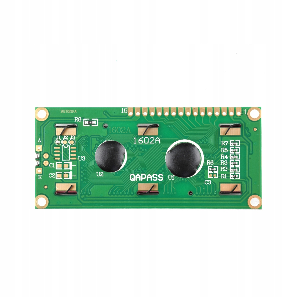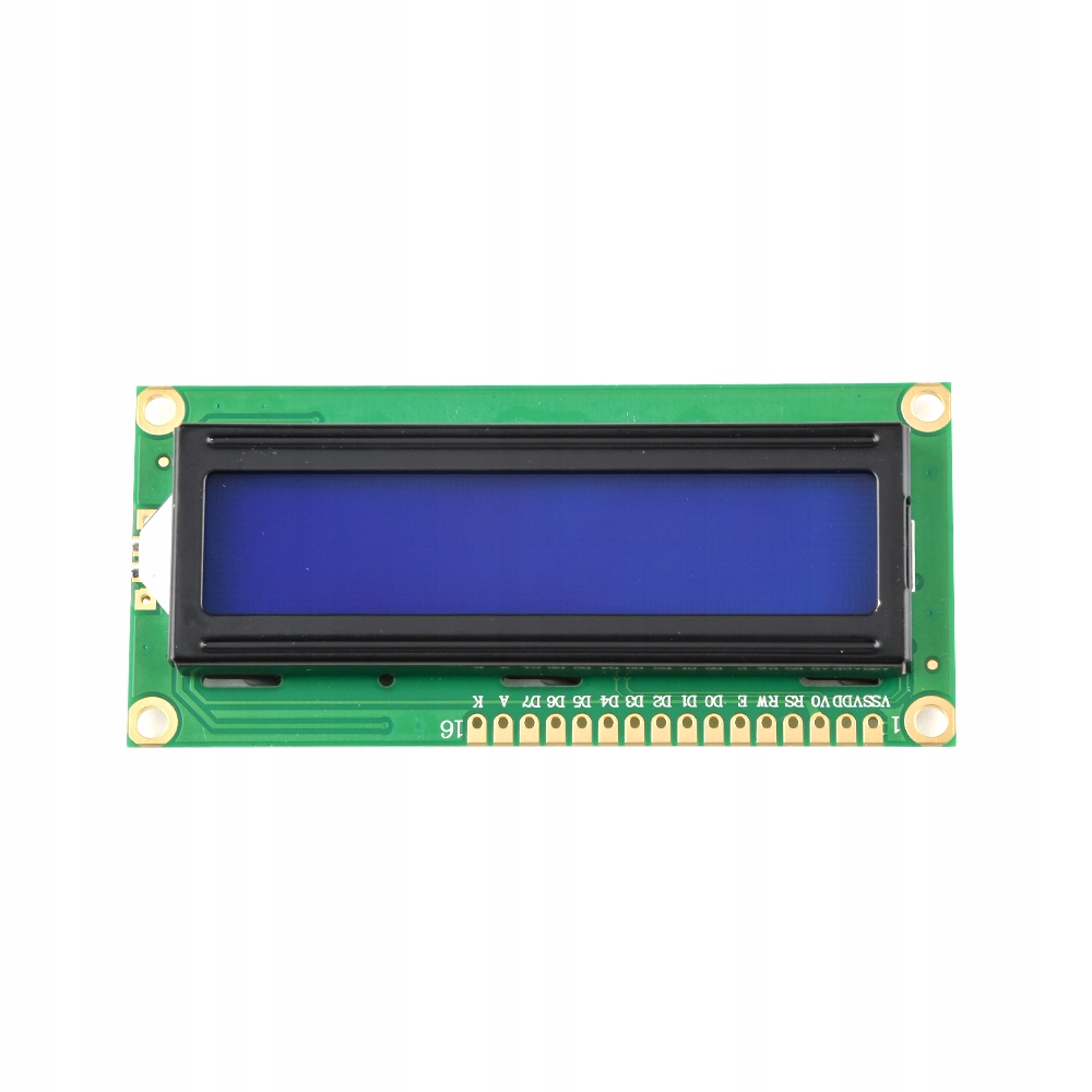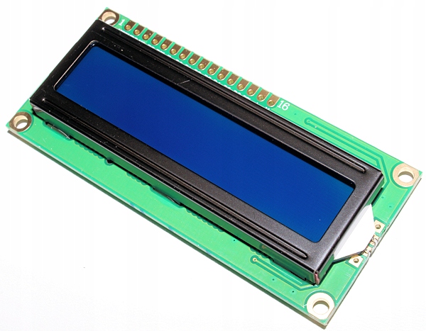 Wyświetlacz alfanumeryczny LCD 16x2 posiada niebieskie podświetlenie z białymi znakami.
