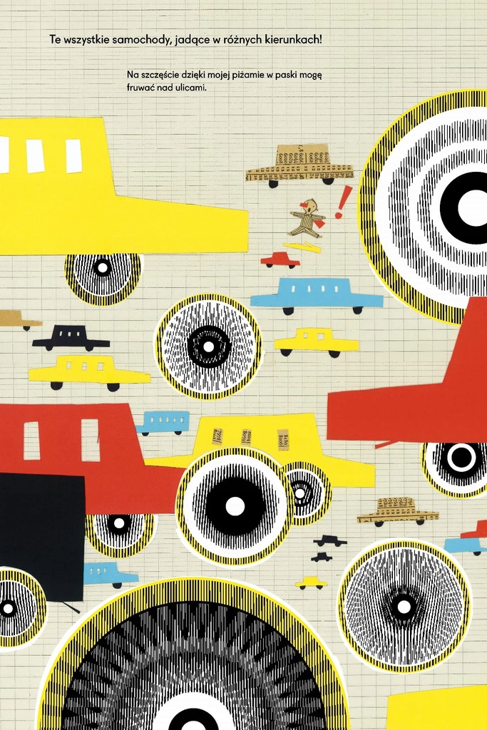 Niezwykła podróż chłopca w piżamie w paski. Dziecko zapada w sen i przenosi się do pełnego zgiełku, świateł i ruchu miasta, które nigdy nie zasypia. I nie byłoby to może nic nadzwyczajnego, gdyby nie fakt, że w tej książce ilustracje się ruszają!