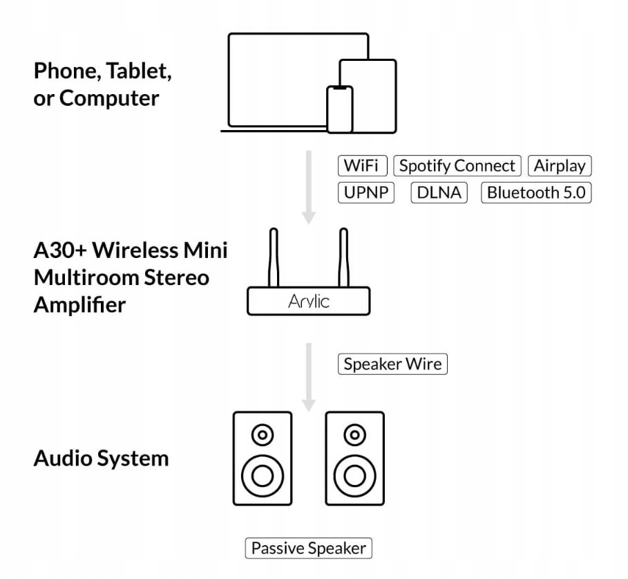 A30+ to jeden z najbardziej opłacalnych i kompaktowych bezprzewodowych wzmacniaczy strumieniowych, umożliwiający strumieniowe przesyłanie wysokiej jakości dźwięku stereo do głośników pasywnych za pośrednictwem wybranej sieci Wi -Fi lub Ethernet . Przesyłaj strumieniowo bezpośrednio z usług strumieniowania online lub przez Airplay , Bluetooth5.0 i SpotifyConnect . Moc wyjściowa 30 W x2 jest idealna do biurka, pokoju lub akademika. Dodaj dodatkowe urządzenia Arylic, aby zbudować system multiroom oraz zarządzaj i steruj wszystkimi urządzeniami Arylic w jednej aplikacji (4STREAM)!