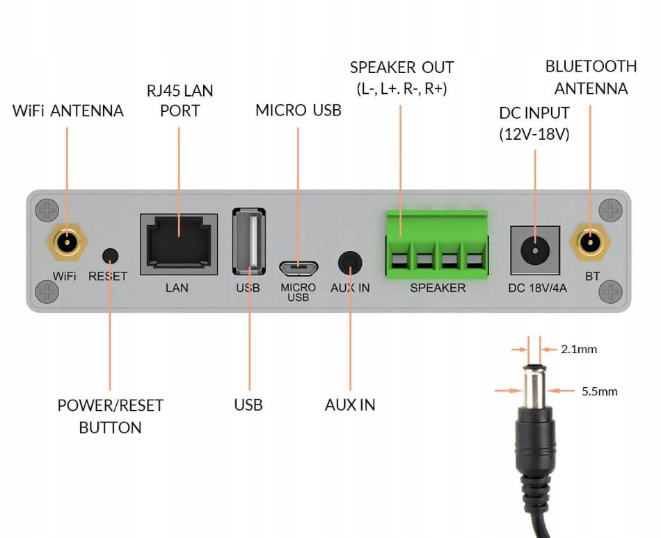 • Dodaj możliwości bezprzewodowe do swojego domowego systemu audio: Dodaj Wi-Fi, AirPlay , Spotify Connect i Bluetooth 5.0 do swoich pasywnych głośników i aktywnych Podłącz istniejące wzmacniacze, przedwzmacniacze i odbiorniki przez optyczne i wejście liniowe RCA.