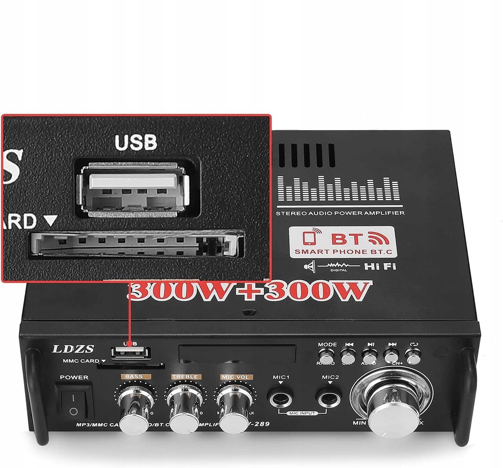 🎶 Wzmacniacz ten posiada wejście USB/SD, co pozwala odtwarzać pliki mp3 lub połączyć się z komputerem.