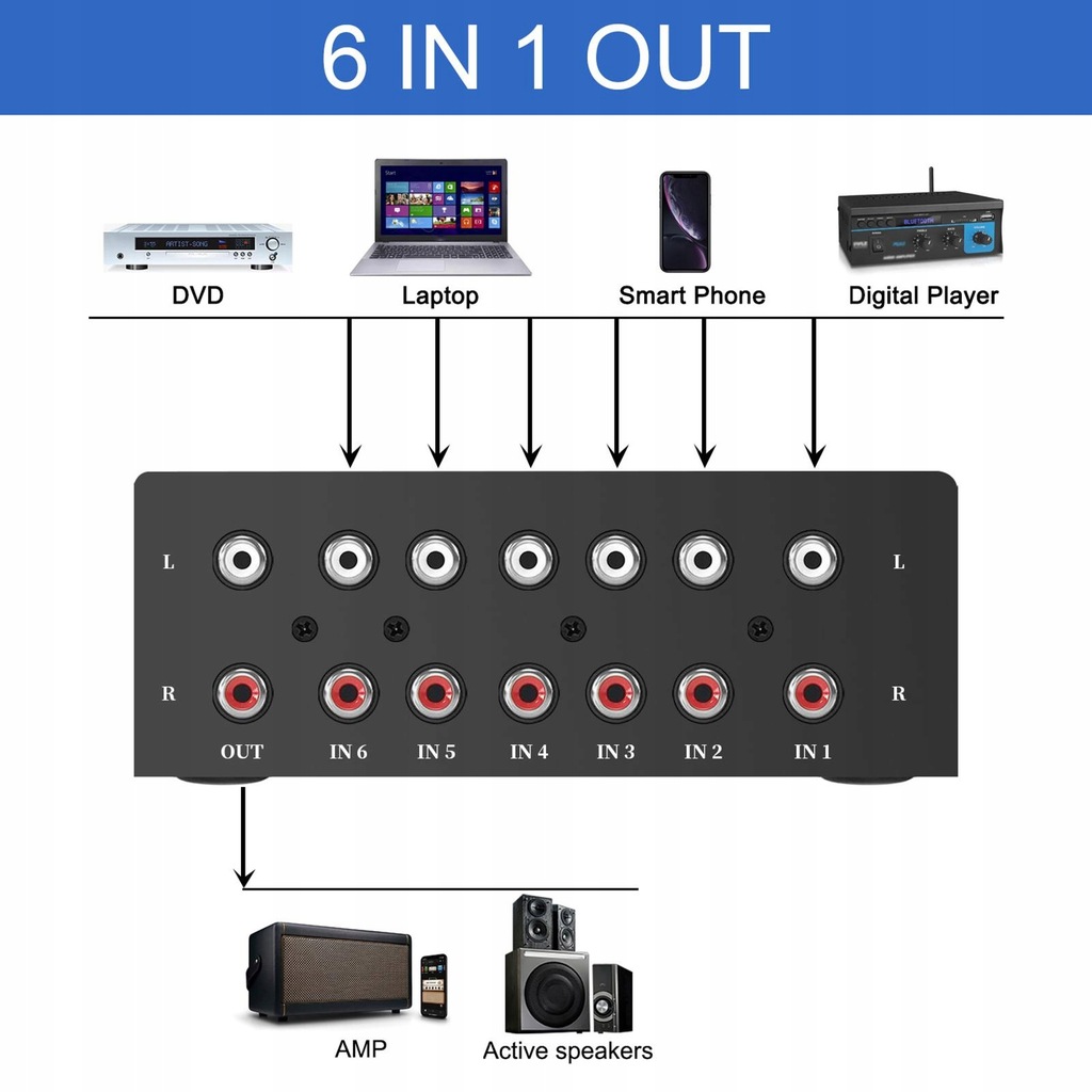 Wzmacniacz audio RCA: 6 grup stereofonicznego interfejsu wejściowego sygnału RCA, 6 wejść audio kanału L/R