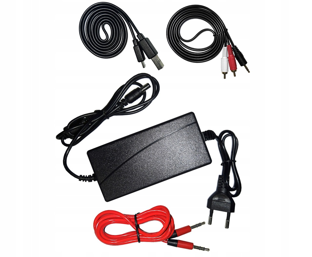 - kabel audio minijack 3,5 mm - 2x RCA, kabel audio minijack 3,5 mm - minijack 3,5 mm, kabel USB, zasilacz USB