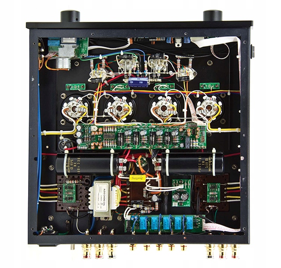 Ceramiczne gniazda lamp, kondensatory zasilające Nichicon, terminale głośnikowe typu WBT, potencjometr głośności ALPS Blue Velvet, złocone gniazda RCA, toroidalny transformator zasilający.