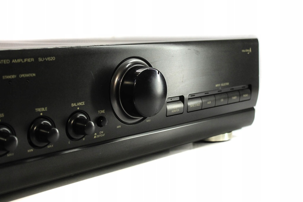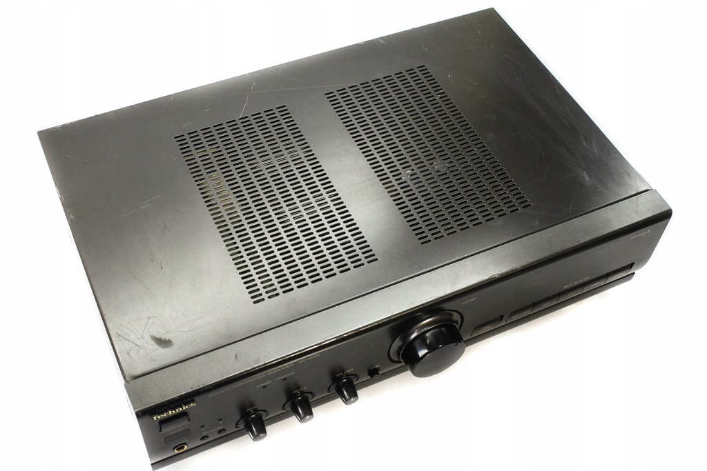 Stan wizualny: Wzmacniacz nosi charakterystyczne ślady użytkowania. Obudowa posiada rysy i otarcia, natomiast nie posiada żadnych uszkodzeń. Panel przedni oceniamy na DOBRY +, kilka nieznacznych rys. Znaczek technics posiada tylko jeden z zaczepów, ale trzyma się bez zastrzeżeń.