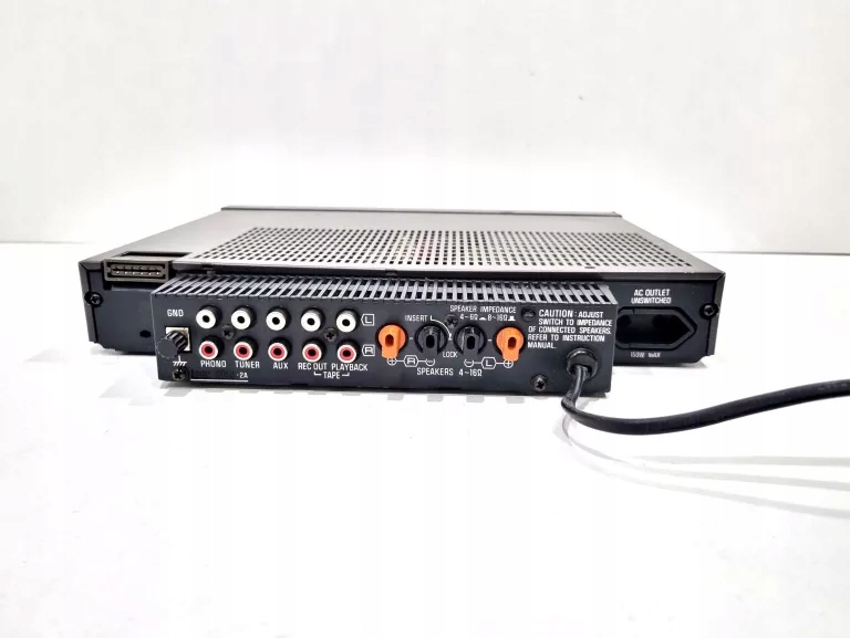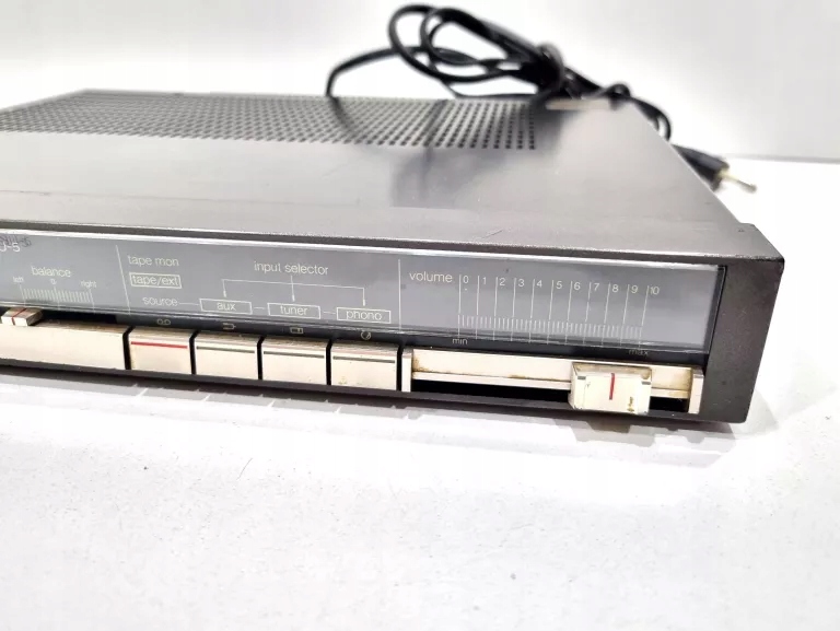 Wzmacniacz sprawny w dobrym stanie, posiada ślady użytkowania w postaci rys, zadrapań oraz otarć.
