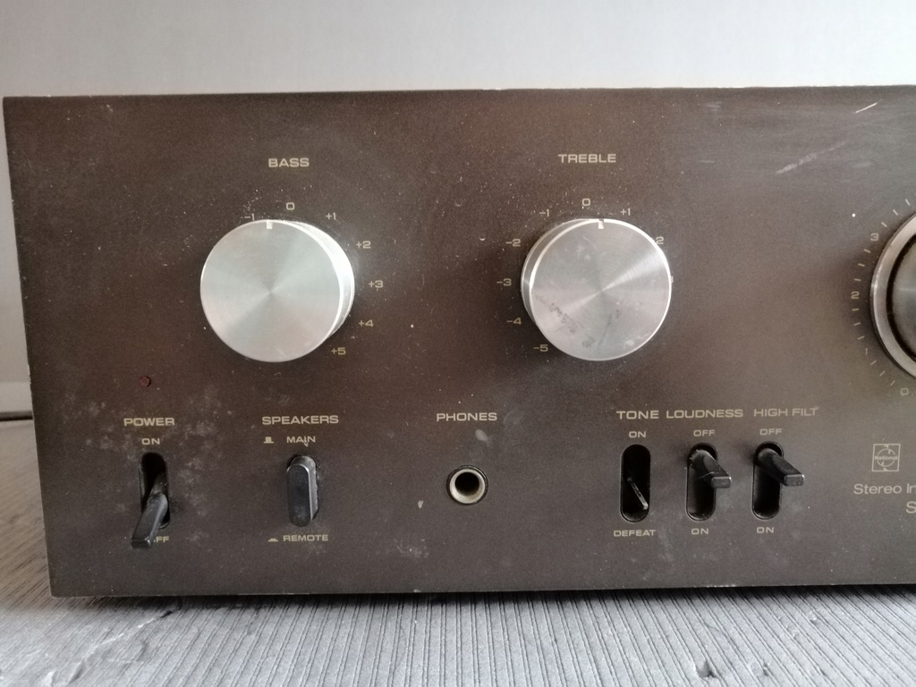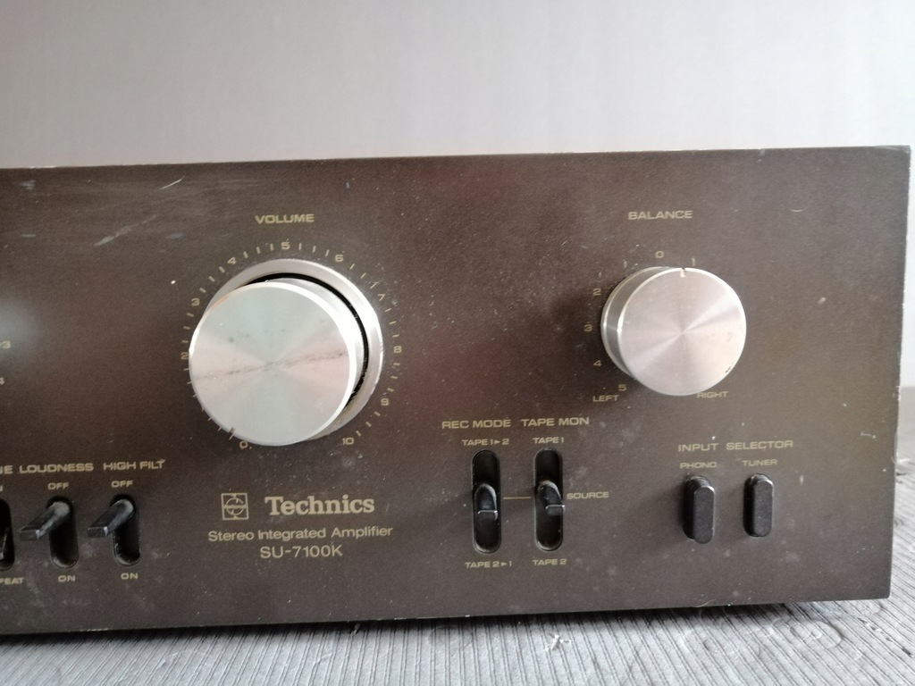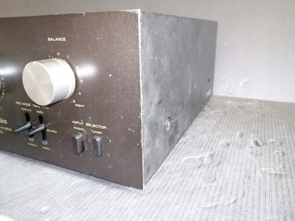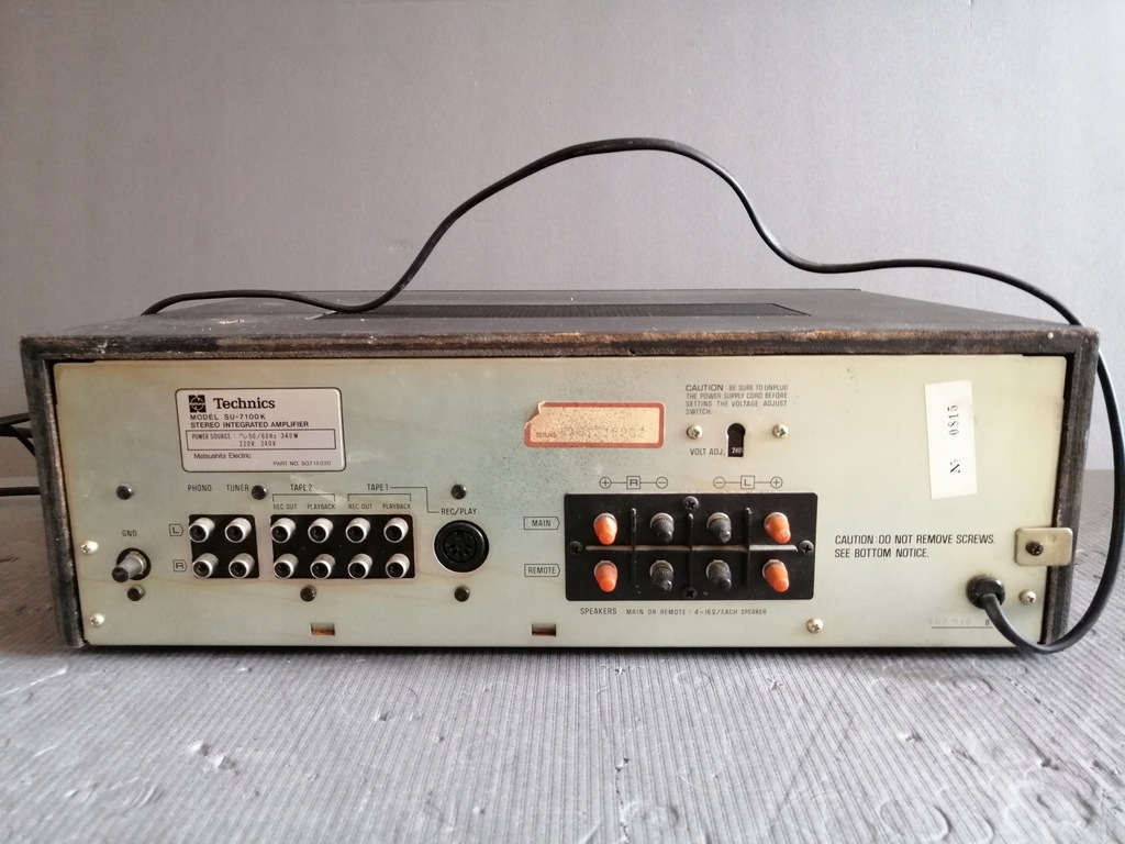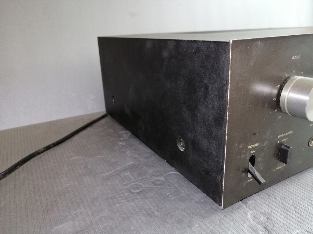 Wzmacniacz Technics Matsushita Electric 340 W, 4-16 Ohm, obudowa drewniana ma od góry mały odprysk, brak jednej nakładki, po podłączeniu głośników słychać szumy i trzaski! dalej nie sprawdzany . Wymiary: 410x135x305 mm.