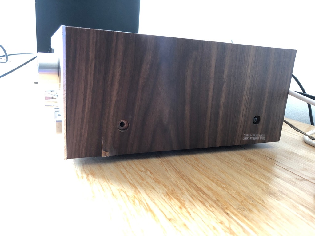 W potencjometrach nic nie trzeszczy a w przełącznikach nie ma trzasków sprzęt po przeglądzie estetycznie dwa ubytki na drewnianej obudowie po bokach i zagięcie metalu z tylu obudowy po za tym ok .